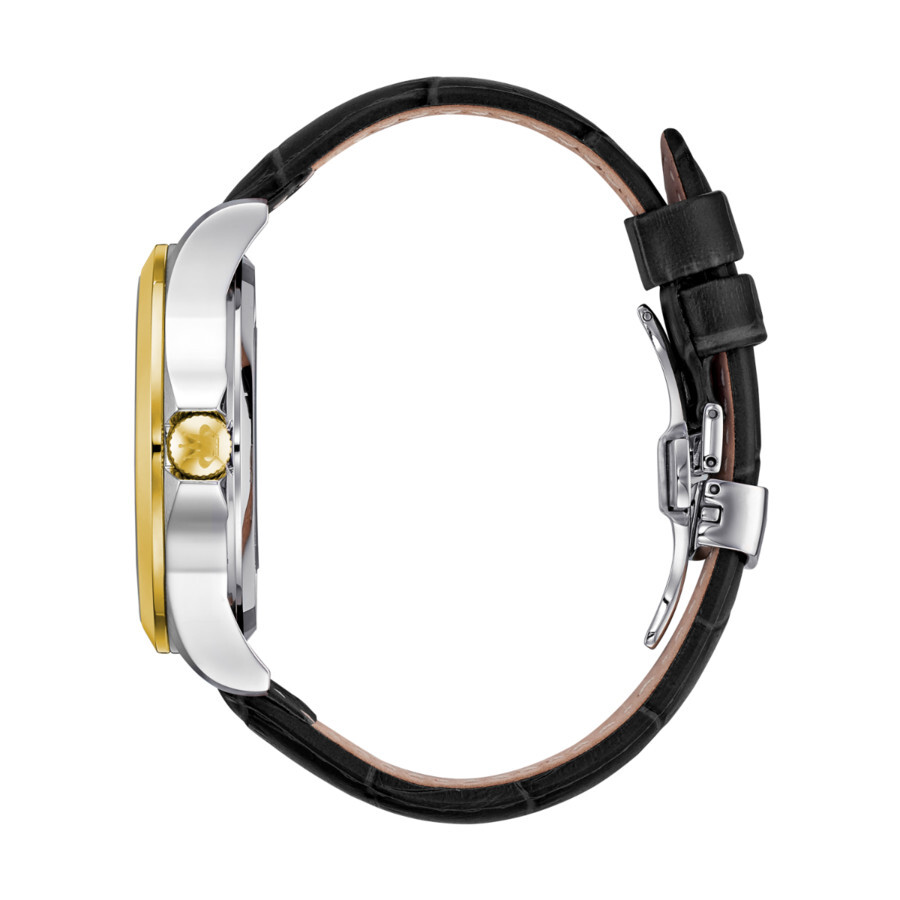 Yellow gold-tone stainless steel case with a black genuine leather strap. Fixed yellow gold-tone stainless steel bezel. White dial with yellow gold-tone hands and Arabic numeral & index hour markers. Minute scale around the inner rim. Dial Type: Analog. Luminescent hands and markers. Date display at the 3 o'clock position. 24 hour subdials. Automatic movement. Scratch resistant mineral crystal. Pull / push crown. Transparent case back. Round case shape, case size: 44 mm, case thickness: 13 mm. Band width: 22 mm, band length: 8.46 inches. Deployment with push button release clasp. Water resistant at 100 meters / 330 feet. Functions: hour, minute, second, power reserve. Cygnus Series. Luxury watch style. Rene Mouris Cygnus Automatic White Dial Men's Watch 70103RM5.