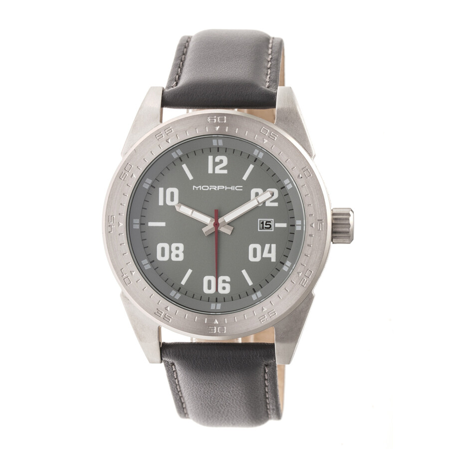 Silver-tone stainless steel case with a grey leather strap. Fixed silver-tone stainless steel bezel. Silver-tone dial with silver-tone hands and Arabic numeral and index hour markers. Minute markers around the outer rim. Dial Type: Analog. Luminescent hands and markers. Date display at the 3 o'clock position. Quartz movement. Scratch resistant mineral crystal. Round case shape, case size: 44 mm, case thickness: 11 mm. Band width: 22 mm. Buckle clasp. Water resistant at 50 meters / 165 feet. Functions: date, hour, minute, second. Casual watch style. Watch label: Japan Movt. Item Variations: MPH6303. Morphic M63 Series Silver Dial Men's Watch 6303.