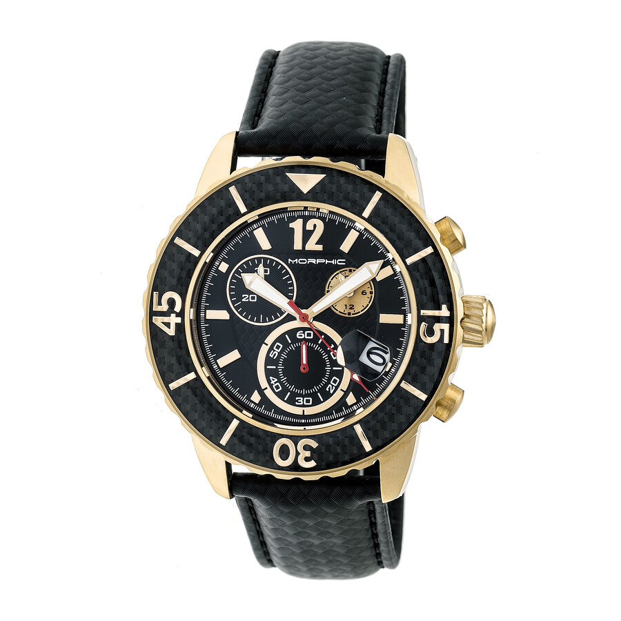 Gold-tone stainless steel case with a black leather strap. Uni-directional rotating gold-tone bezel with a black carbon fiber inlayl. Black dial with gold-tone hands and index hour markers. Minute markers around the outer rim. Dial Type: Analog. Luminescent hands. Date display at the 4 o'clock position. Chronograph - three sub-dials displaying: 60 second, 30 minute and 24 hour. Quartz movement. Scratch resistant mineral crystal. Solid case back. Round case shape. Case size: 45 mm. Case thickness: 14 mm. Band width: 22 mm. Tang clasp. Water resistant at 100 meters / 330 feet. Functions: chronograph, date, hour, minute, second. M51 Series Series. Sport watch style. Item Variations: MPH5102. Morphic M51 Series Chronograph Black Dial Men's Watch 5102.