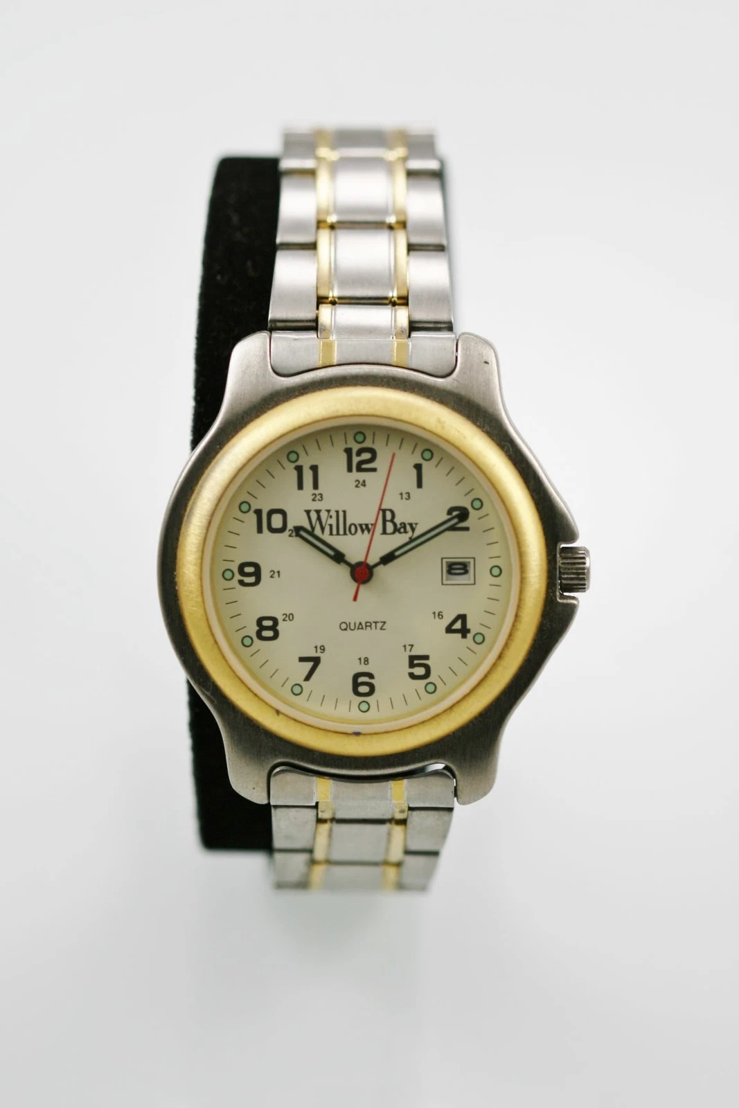 Willow Bay Watch Mens Stainless Silver Gold Water Resist Beige Date 24hr Quartz