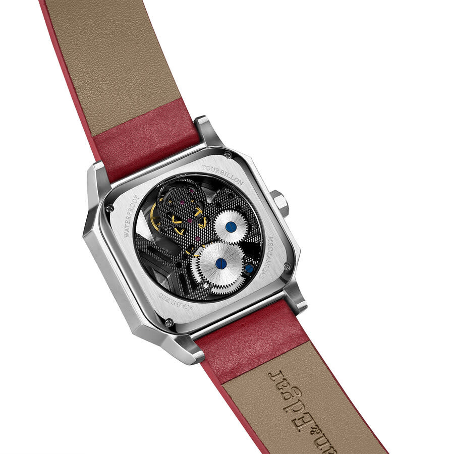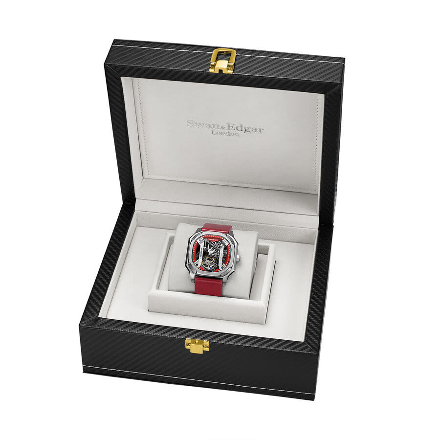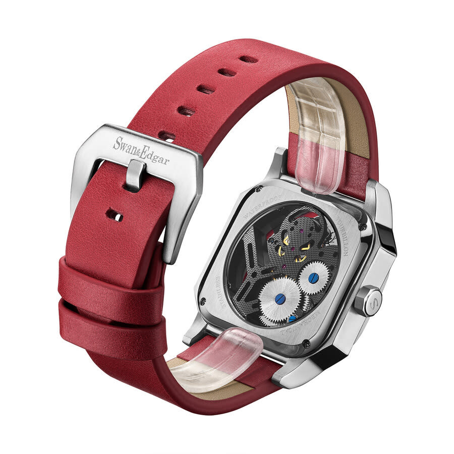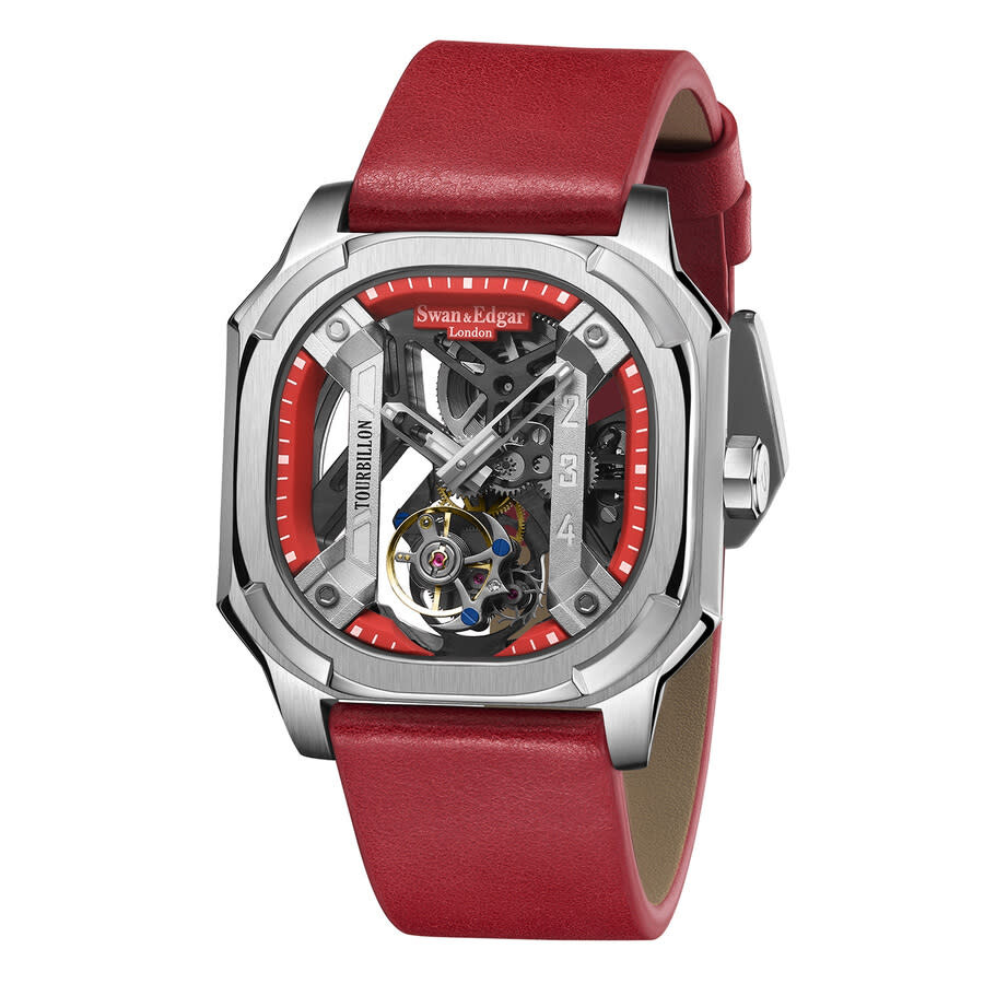 Silver-tone stainless steel case with a red leather strap. Fixed silver-tone stainless steel bezel. Transparent dial with silver-tone hands and Arabic numeral hour markers. Minute markers around the outer rim. Dial Type: Analog. Automatic movement. Scratch resistant sapphire crystal. Transparent case back. Cushion case shape, case size: 43 mm, case thickness: 15 mm. Band width: 20 mm, band length: 7.75 inches. Buckle clasp. Water resistant at 30 meters / 100 feet. Functions: hour, minute, second. Vortex Series. Luxury watch style. Swan Edgar Vortex Automatic Men's Watch SE1792T.