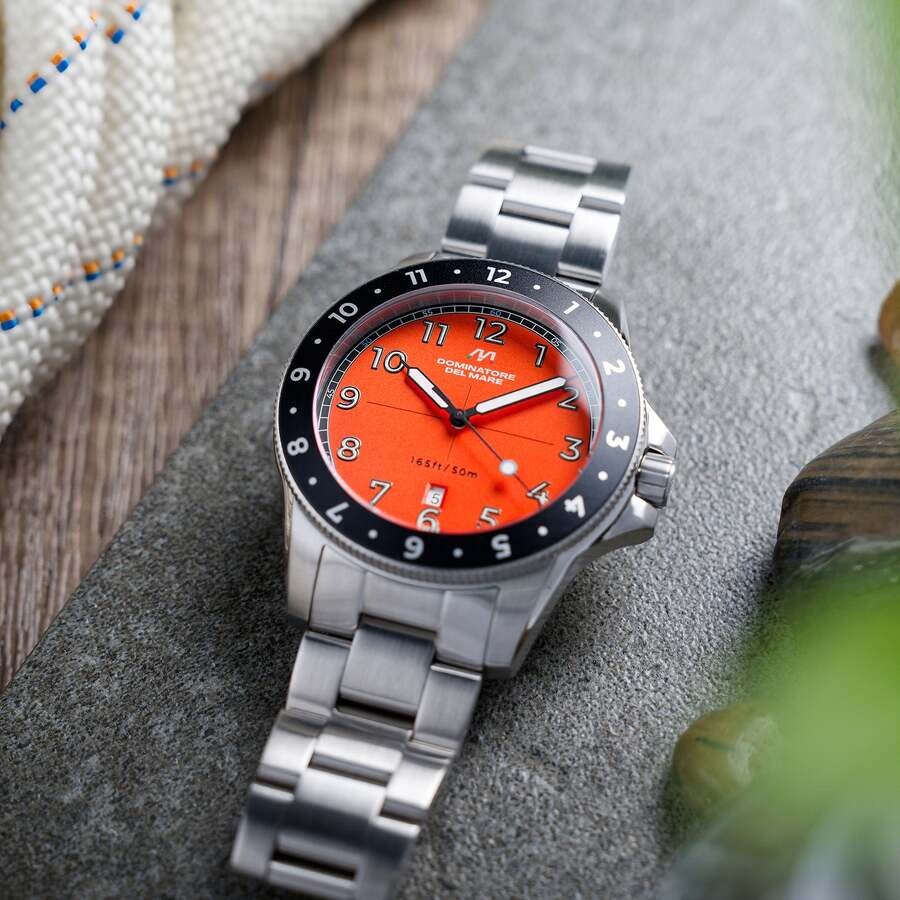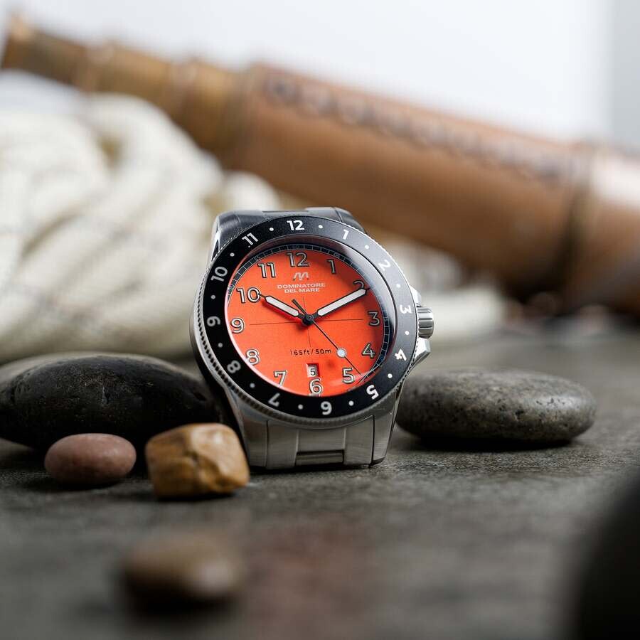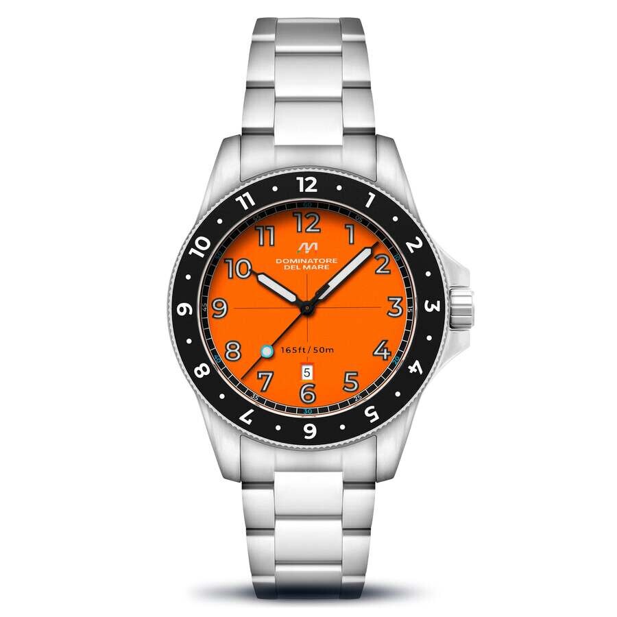 The Bandiera features a Japan Quartz movement with a date display, contained within a 42mm case diameter. Its unidirectional turning bezel adds a stylish touch, while its band provides comfortable and reliable wearing. Ideal for those who appreciate classic timepieces. Silver-tone stainless steel case and bracelet. Uni-directional rotating black stainless steel bezel. Orange dial with black hands and Arabic numeral hour markers. Minute markers around the outer rim. Dial Type: Analog. Luminescent hands and markers. Date display at the 6 o'clock position. Seiko - VJ32 quartz movement. Pull / push crown. Solid case back. Round case shape, case size: 42 mm, case thickness: 12.5 mm. Band width: 20 mm, band length: 8 inches. Fold over clasp with a safety release. Water resistant at 50 meters / 165 feet. Functions: date, hour, minute, second. Bandiera Series. Casual watch style. Dominatore Del Mare Bandiera Quartz Orange Dial Men's Watch DD-8020-77.