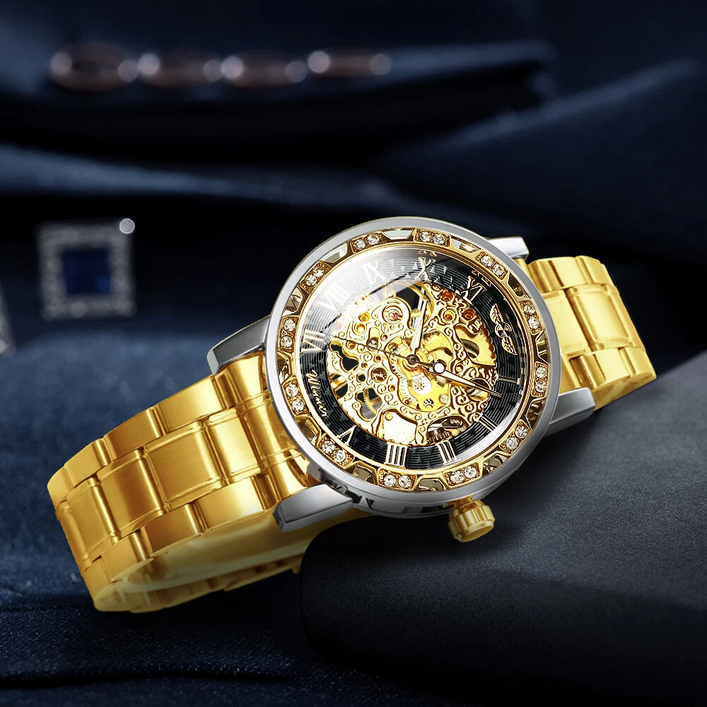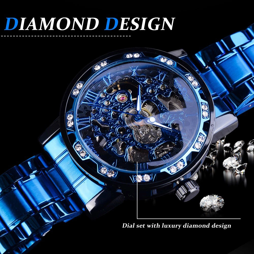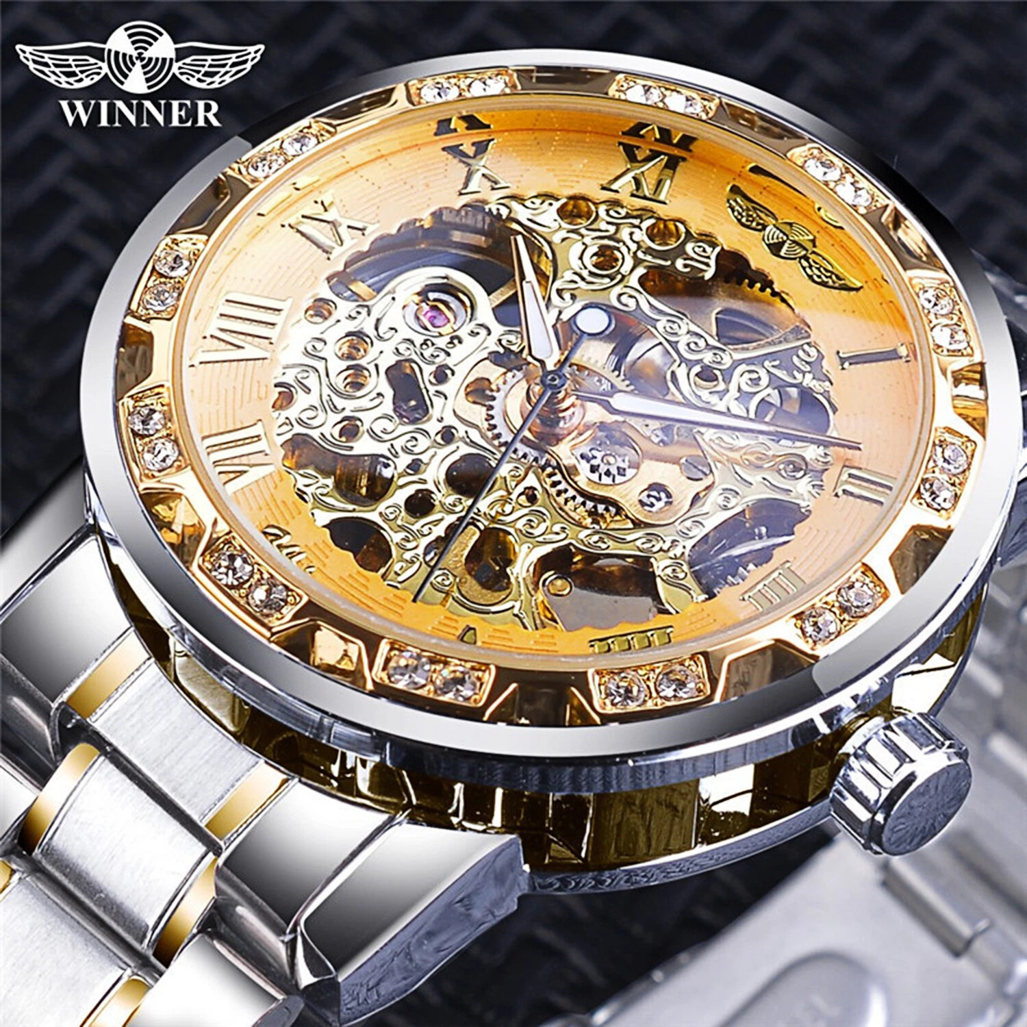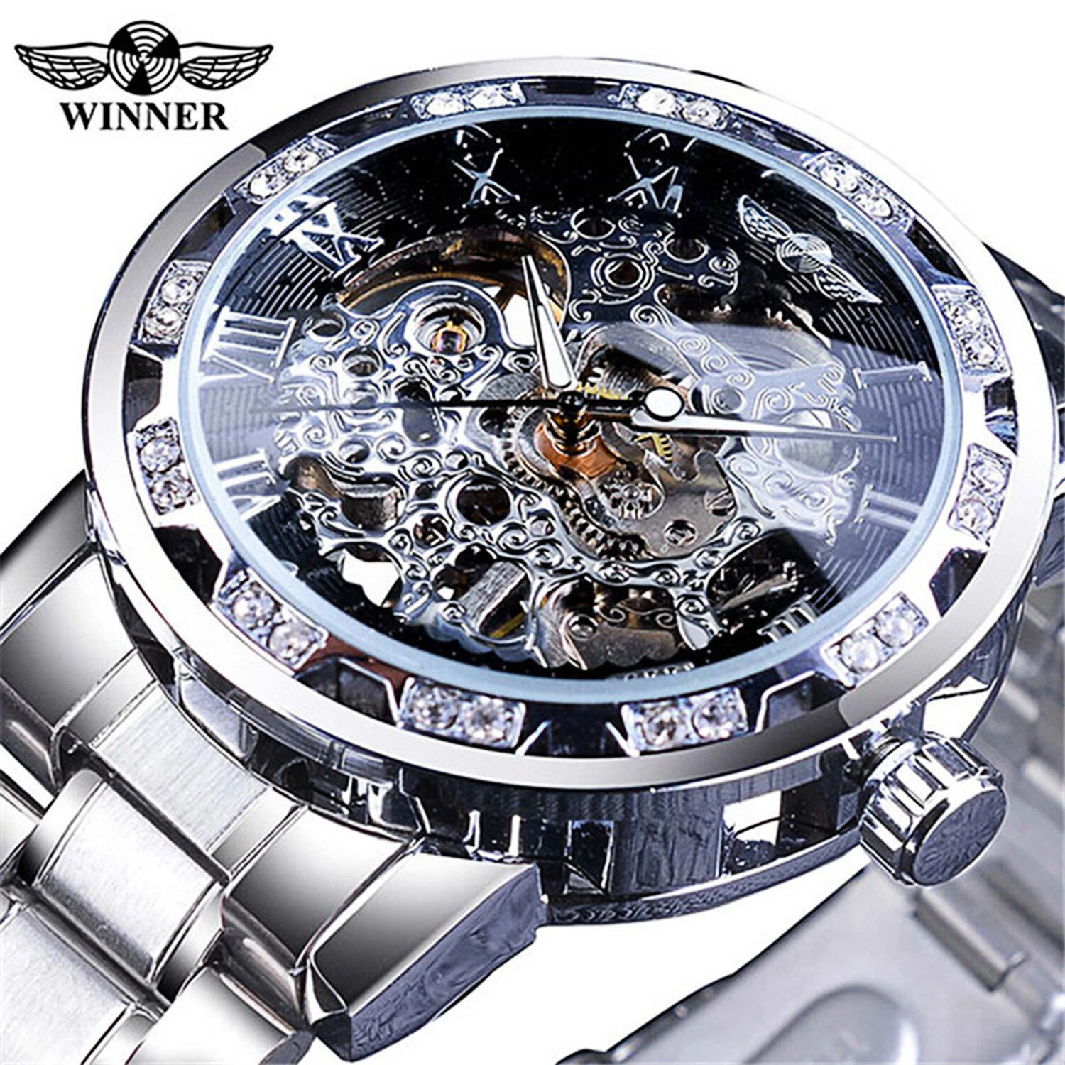 T-WINNER MEN'S STAINLESS STEEL VINTAGE DIAMOND HOLLOW SKELETON MECHANICAL WATCH