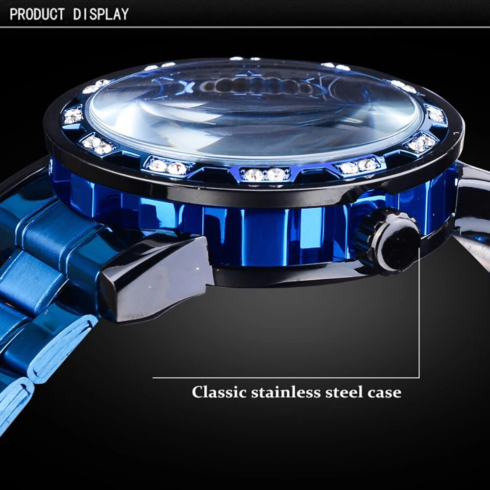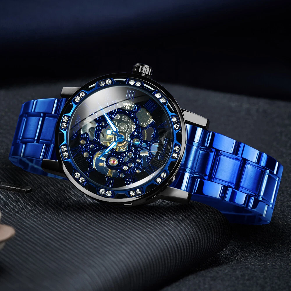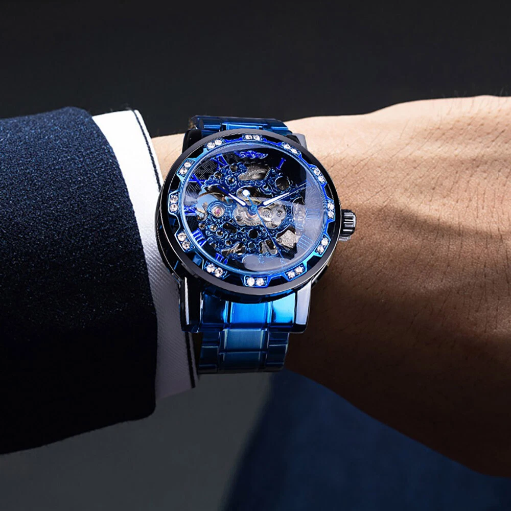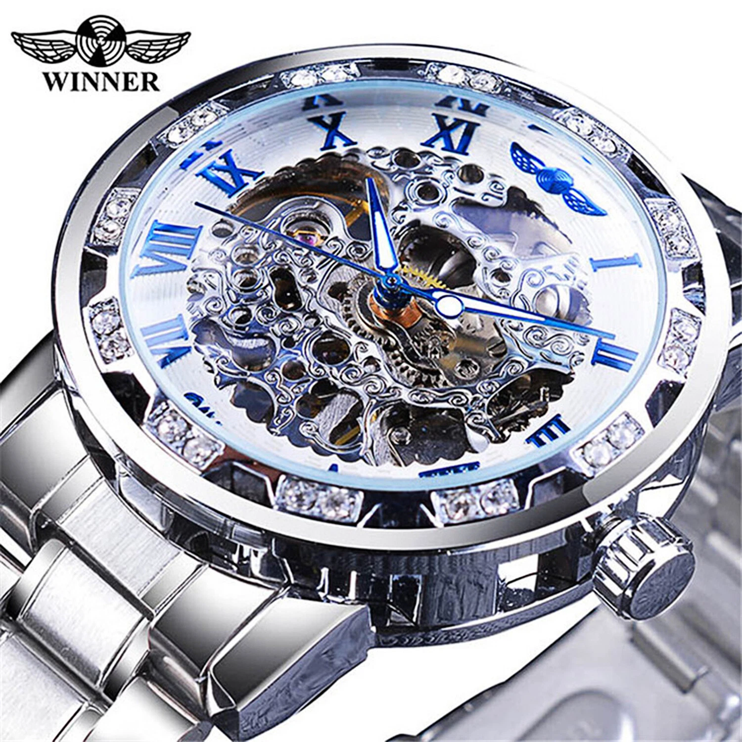T-WINNER MEN'S STAINLESS STEEL VINTAGE DIAMOND HOLLOW SKELETON MECHANICAL WATCH