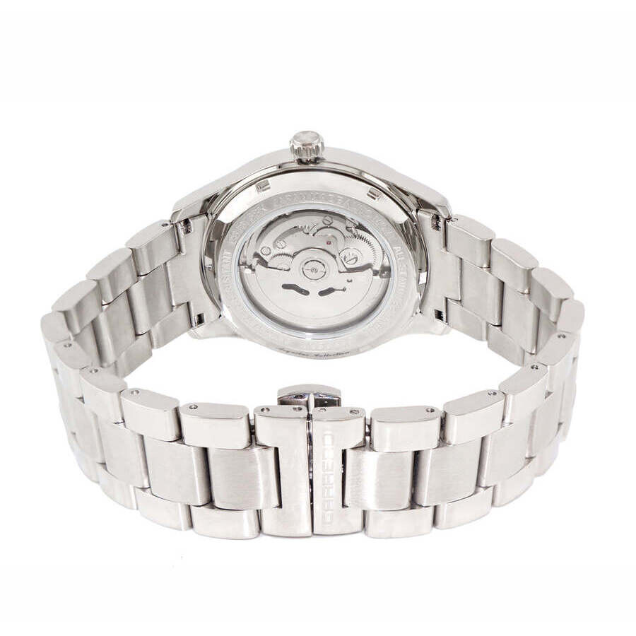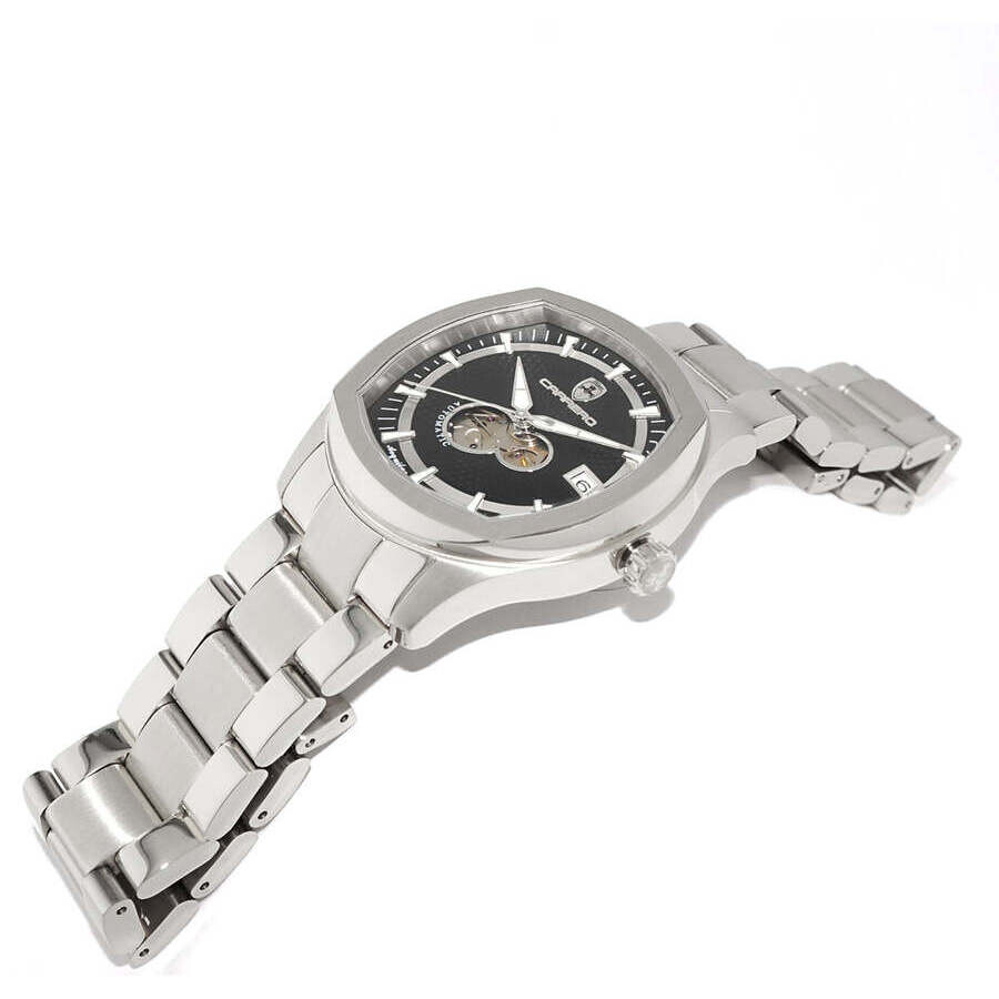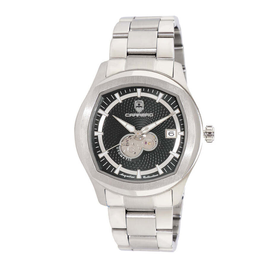 Silver-tone stainless steel case and bracelet. Fixed silver-tone stainless steel bezel. Black dial with silver-tone hands and index hour markers. Minute scale around the inner rim. Dial Type: Analog. Luminescent hands and markers. Date display at the 3 o'clock position. SII Caliber NH35A Automatic movement, containing 24 Jewels, bitting at 21600 vph, and has a power reserve of approximately 41 hours. Scratch resistant mineral crystal. Pull / push crown. Transparent case back. Round case shape, case size: 42 mm, case thickness: 12.25 mm. Band width: 22 mm, band length: 7.5 inches. Deployment with push button release clasp. Water resistant at 50 meters / 165 feet. Functions: date, hour, minute, second. Additional Info: sunray dial with heart beat - 24 jewel automatic. Aequilux Series. Casual watch style. Watch label: Japan Movt. Torino Carrero Aequilux Black Dial Men's Watch C1S1875-BK.