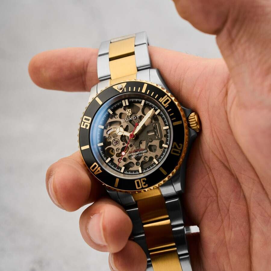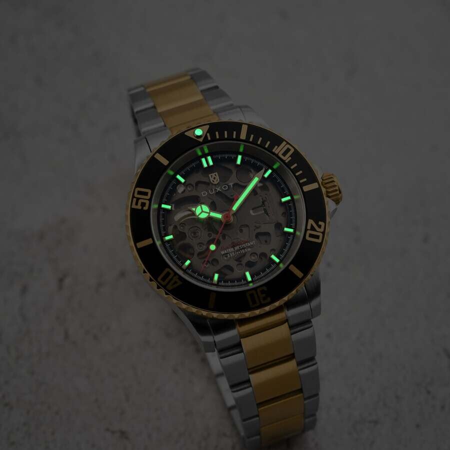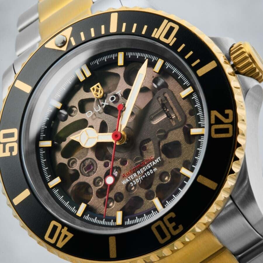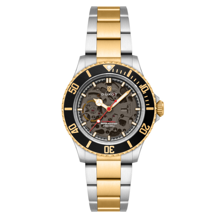 The Atlantica Skeleton Automatic redefines the classic dive watch with a modern twist. Featuring the NH70 automatic skeletonized movement, the transparent dial proudly displays its intricate inner workings. With water-resistant up to 100 meters, this watch is not only a stylish accessory but also a reliable companion for all your adventures. Silver-tone stainless steel case with a two-tone (silver-tone and yellow gold-tone) stainless steel bracelet. Uni-directional rotating black stainless steel bezel. Black dial with yellow gold-tone hands and index hour markers. Minute markers around the outer rim. Dial Type: Analog. Luminescent hands and markers. SII Caliber NH70A Automatic movement, containing 24 Jewels, bitting at 21600 vph, and has a power reserve of approximately 41 hours. Scratch resistant sapphire crystal. Pull / push crown. Transparent case back. Round case shape, case size: 40 mm, case thickness: 13 mm. Band width: 20 mm, band length: 8 inches. Fold over clasp with a safety release. Water resistant at 100 meters / 330 feet. Functions: hour, minute, second. Atlantica Series. Casual watch style. Watch label: Japan Movt. Duxot Atlantica Automatic Black Dial Men's Watch DX-2067-44.