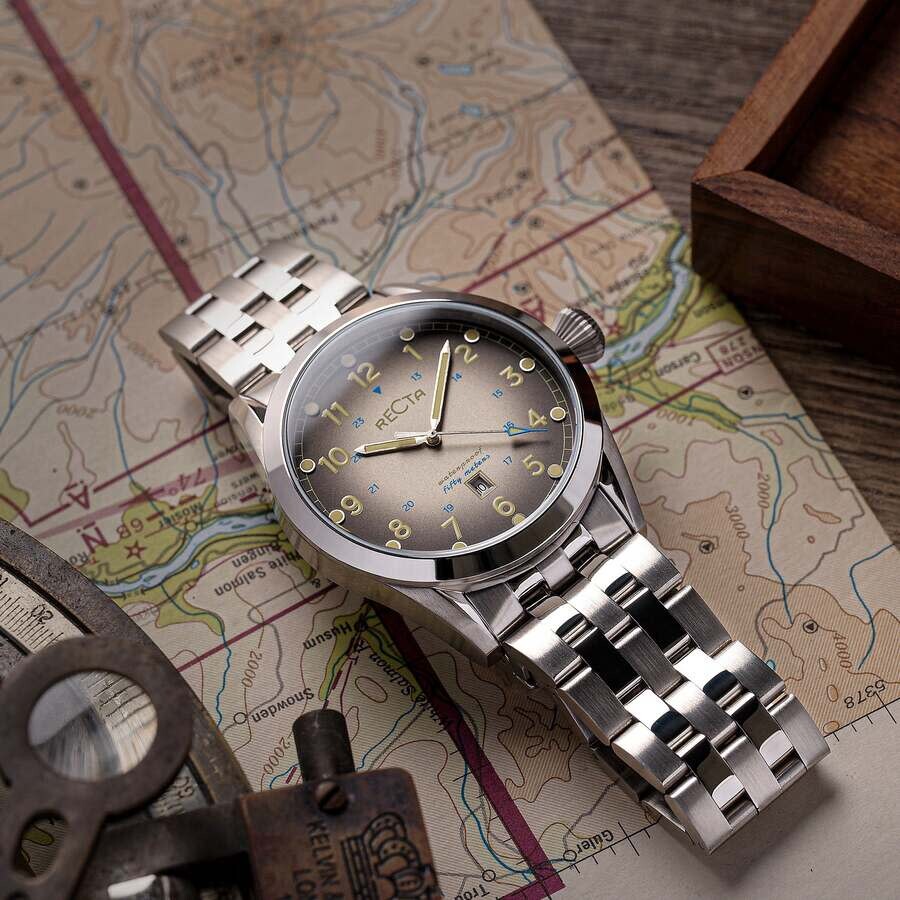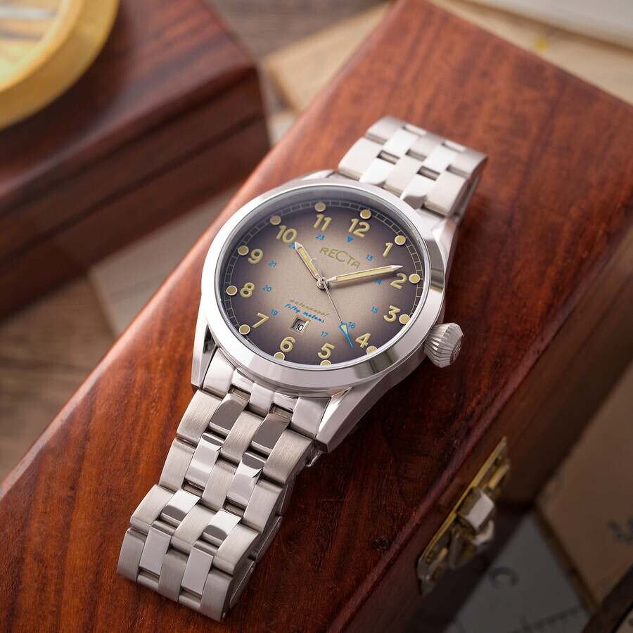 The Cavalier has a spirit of bravado that is anchored around a mission-critical need for functionality. It's fuss-free, reliable, and precise. Grey stainless steel case with a silver-tone stainless steel bracelet. Fixed silver-tone stainless steel bezel. Grey dial with silver-tone hands and Arabic numeral hour markers. Minute markers around the outer rim. Dial Type: Analog. Luminescent hands and markers. Date display at the 6 o'clock position. Seiko - VJ32 quartz movement. Scratch resistant mineral crystal. Pull / push crown. Solid case back. Round case shape, case size: 45 mm, case thickness: 12 mm. Band width: 24 mm, band length: 8 inches. Fold over clasp with a safety release. Water resistant at 50 meters / 165 feet. Functions: date, hour, minute, second. Cavalier Series. Casual watch style. Recta Cavalier Quartz Grey Dial Men's Watch RT-3005-77.