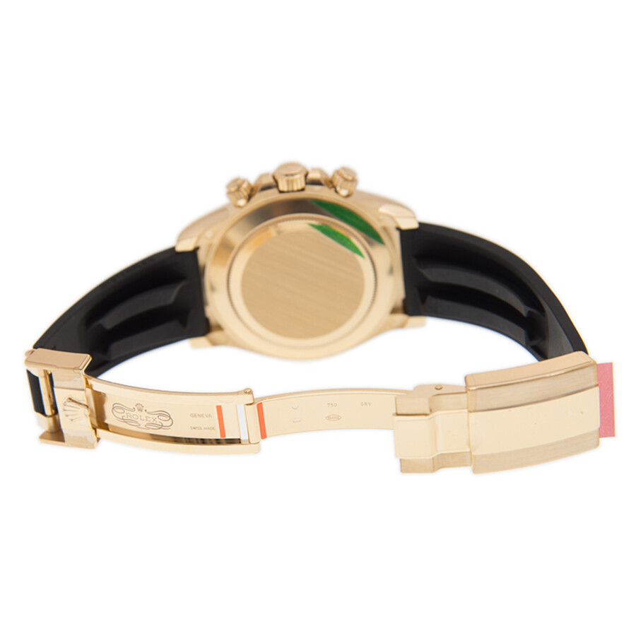 18kt rose gold case with a black rubber oysterflex strap. Fixed diamond set bezel. Yellow-tone dial with gold-tone hands and diamond hour markers. Dial Type: Analog. Chronograph - three sub-dials displaying: 60 second, 30 minute and 12 hour. Rolex Calibre 4130 automatic movement with a 72-hour power reserve. Scratch resistant sapphire crystal. Screw down crown. Solid case back. Round case shape, case size: 40 mm, case thickness: 12.4 mm. Band width: 20 mm. Oysterlock clasp. Water resistant at 100 meters / 330 feet. Functions: chronograph, hour, minute, small second, chronometer. Additional Info: original box, international warranty card, manual (complete accessories). Luxury watch style. Watch label: Swiss Made. Rolex Cosmograph Daytona Eye of the Tiger Chronograph Automatic Chronometer Diamond Men's Watch 116588TBR-0003.