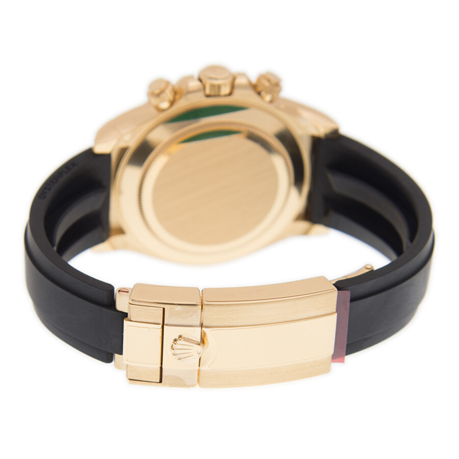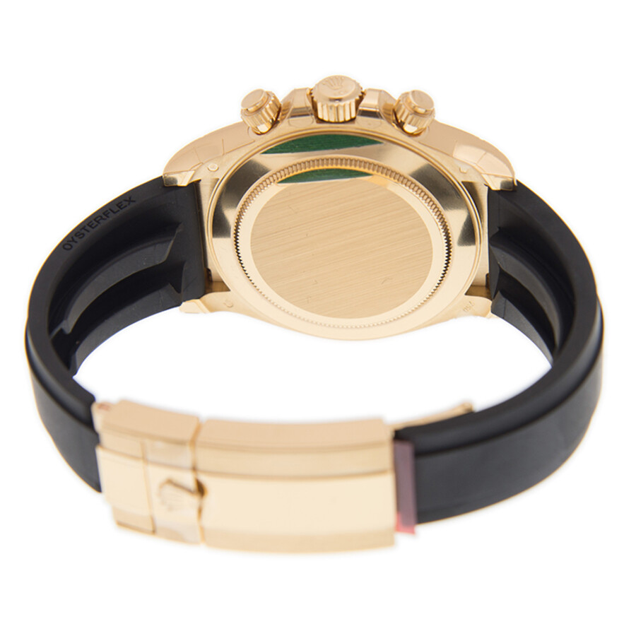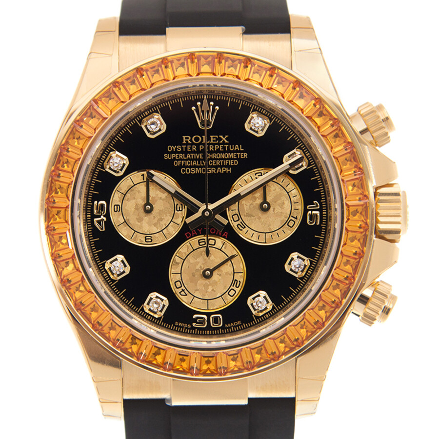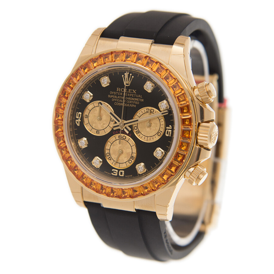 Gold-tone 18kt rose gold case with a black rubber oysterflex strap. Fixed orange sapphire bezel. Black dial with gold-tone hands and diamond hour markers. Dial Type: Analog. Chronograph - three sub-dials displaying: 60 second, 30 minute and 12 hour. Rolex Calibre 4130 automatic movement with a 72-hour power reserve. Scratch resistant sapphire crystal. Screw down crown. Solid case back. Round case shape, case size: 40 mm, case thickness: 12.4. Oysterlock clasp. Water resistant at 100 meters / 330 feet. Functions: chronograph, hour, minute, small second, chronometer. Additional Info: original box, international warranty card, manual (complete accessories). Luxury watch style. Watch label: Swiss Made. Rolex Cosmograph Daytona Chronograph Automatic Chronometer Diamond Black Dial Watch 116588 SACO.