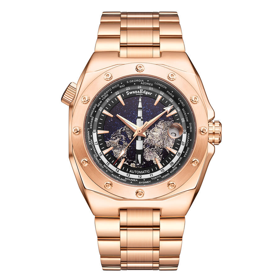 Rose gold-tone stainless steel case and bracelet. Fixed rose gold-tone stainless steel bezel. Black dial with rose gold-tone hands and index hour markers. Minute markers around the outer rim. Dial Type: Analog. Luminescent hands and markers. Date display at the 3 o'clock position. Automatic movement. Scratch resistant mineral crystal. Solid case back. Round case shape, case size: 44.5 mm, case thickness: 15 mm. Band width: 28 mm, band length: 8.5 inches. Fold over clasp with a safety release. Water resistant at 30 meters / 100 feet. Functions: date, hour, minute, second. Apollo Series. Luxury watch style. Swan Edgar Apollo Automatic Black Dial Men's Watch SE00972.