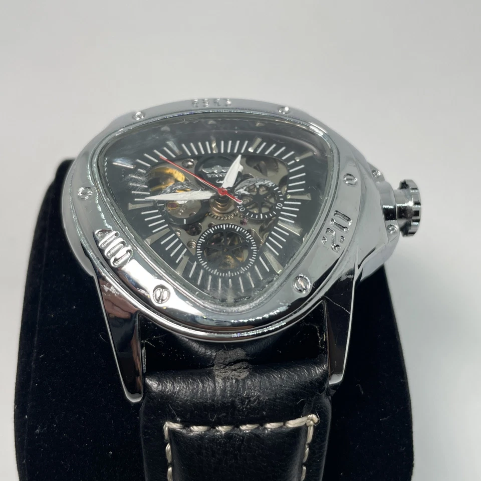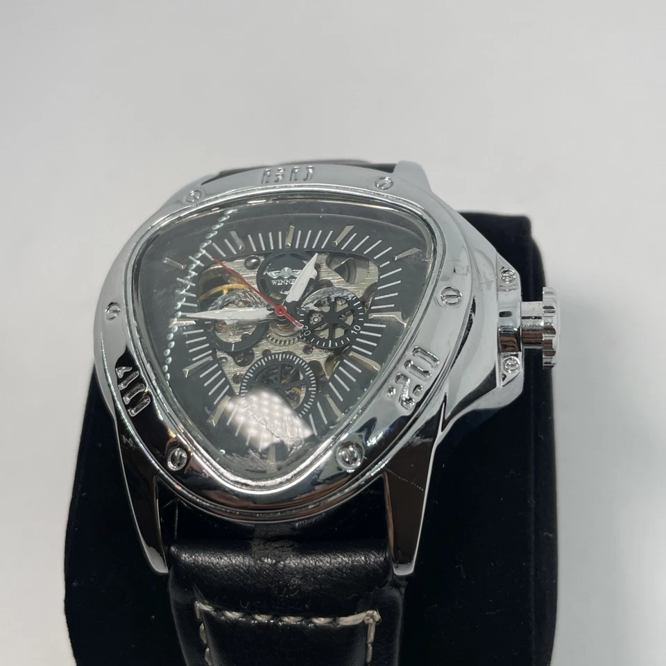 Winner Automatic Skeleton Watch Men 53mm Silver Triangle Dial Glass Scratch