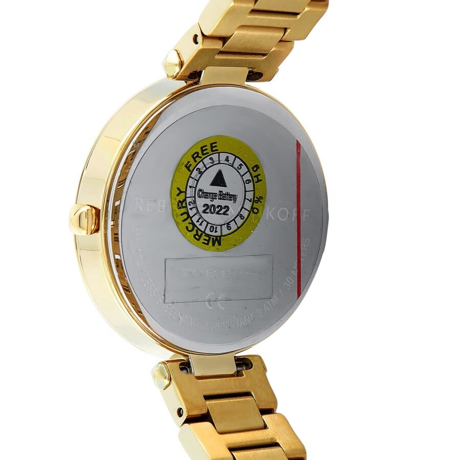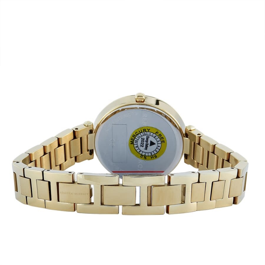 Gold-tone stainless steel case and bracelet. Fixed gold-tone bezel. Black dial with gold-tone hands and index hour markers. Dial Type: Analog. Quartz movement. Scratch resistant mineral crystal. Pull / push crown. Solid case back. Round case shape. Case size: 33 mm. Jewelry clasp. Water resistant at 30 meters / 100 feet. Functions: hour, minute. Nina Series. Luxury watch style. Rebecca Minkoff Nina Quartz Black Dial Gold-tone Ladies Watch 200277.