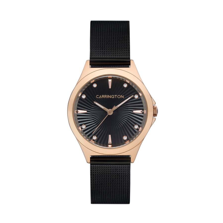 Gold-tone stainless steel case with a black stainless steel bracelet. Fixed rose gold-tone stainless steel bezel. Black dial with rose gold-tone hands and index hour markers. Dial Type: Analog. Luminescent hands. Quartz movement. Scratch resistant mineral crystal. Solid case back. Round case shape, case size: 38 mm, case thickness: 8 mm. Band width: 20 mm, band length: 8 inches. Fold over clasp with a safety release. Functions: hour, minute, second. Rania Series. Casual watch style. Carrington Rania Quartz Black Dial Ladies Watch CT-2017-55.