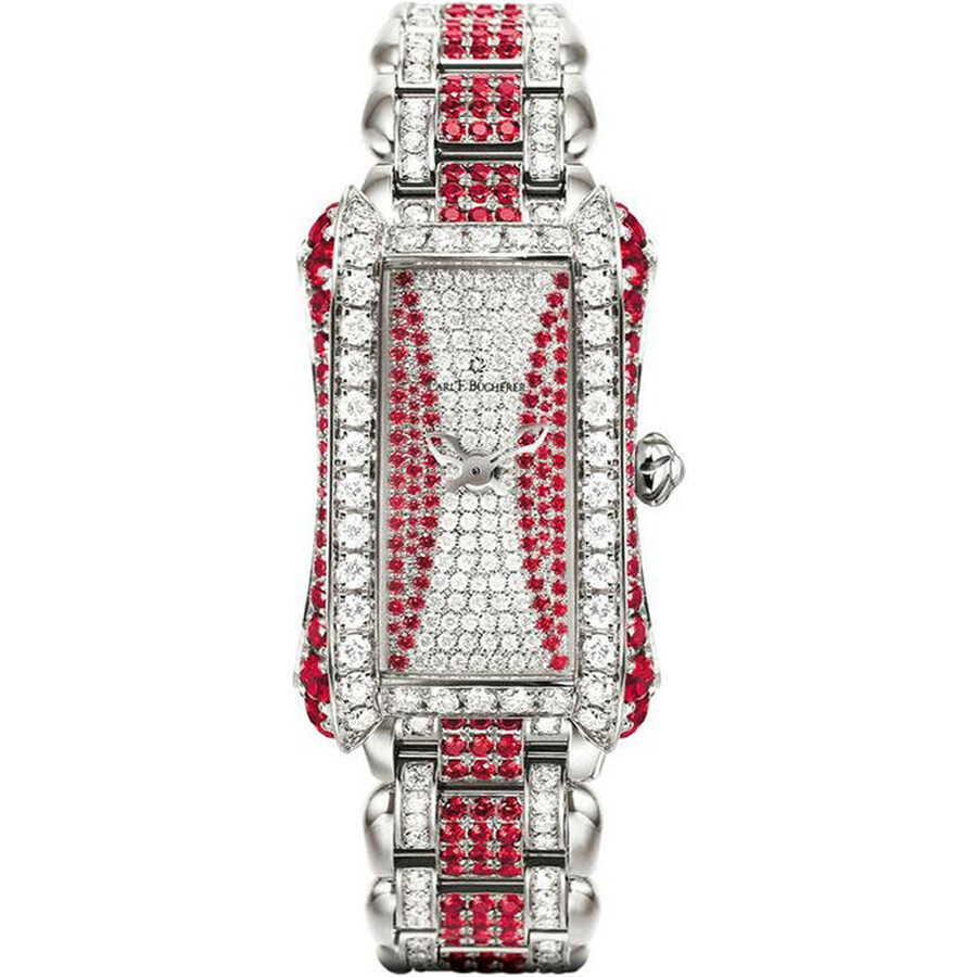 18kt white gold case with a white gold-tone 18kt white gold bracelet. Fixed 18kt white gold diamond set bezel. Diamond pave with rubies dial with silver-tone hands. Dial Type: Analog. Carl F. Bucherer Calibre CFB 1850 quartz movement. Scratch resistant sapphire crystal. Pull / push crown. Solid case back. Unique case shape, case size: 38 mm x 26 mm, case thickness: 7.4 mm. Water resistant at 30 meters / 100 feet. Functions: hour, minute. Additional Info: limited edition of 25 pieces. Luxury watch style. Watch label: Swiss Made. Item Variations: 369.355.6. Carl F. Bucherer Alacria Ladies Watch 00.10702.02.90.13.