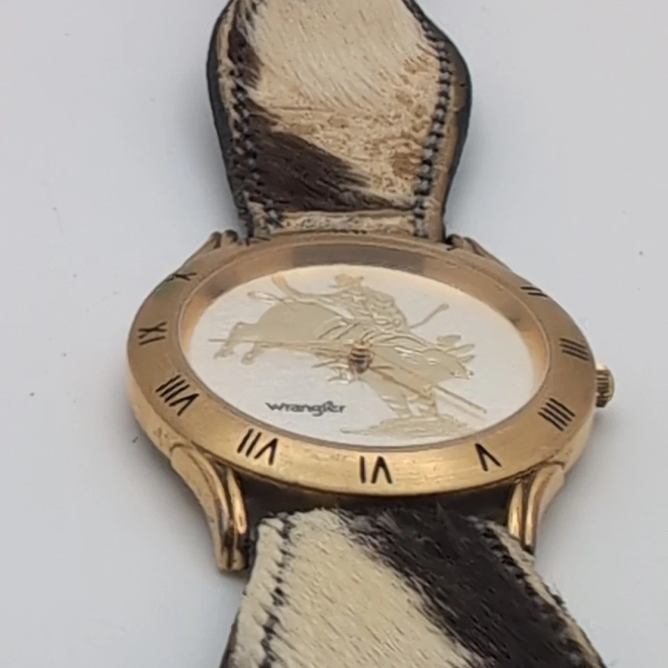 VTG  RARE Wrangler Bull Riding 2 Tone SS Wristwatch w Cowhide & Silver Tip Band