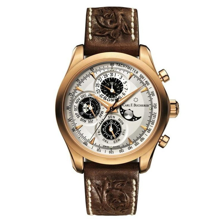 18kt rose gold case with a brown leather strap. Fixed 18kt rose gold bezel. Silver dial with rose gold-tone hands and index hour markers. Tachymeter scale around the outer rim. Dial Type: Analog. Luminescent hands. Perpetual calendar. Chronograph - three sub-dials displaying: 60 seconds/date, 30 minutes/month/leap yeay, 12 hours/day. Carl F. Bucherer Calibre CFB 1904 automatic movement with a 50-hour power reserve. Scratch resistant sapphire crystal. Skeleton transparent exhibition see through case back. Round case shape. Case size: 42.5 mm. Water resistant at 30 meters / 100 feet. Functions: perpetual calendar, moon phase, chronograph, flyback, leap year, month, date, day, hour, minute, second. Luxury watch style. Watch label: Swiss Made. Item Variations: 169.022.2. Carl F. Bucherer Manero Chronograph Perpetual Automatic Men's Watch 00.10906.03.13.99.