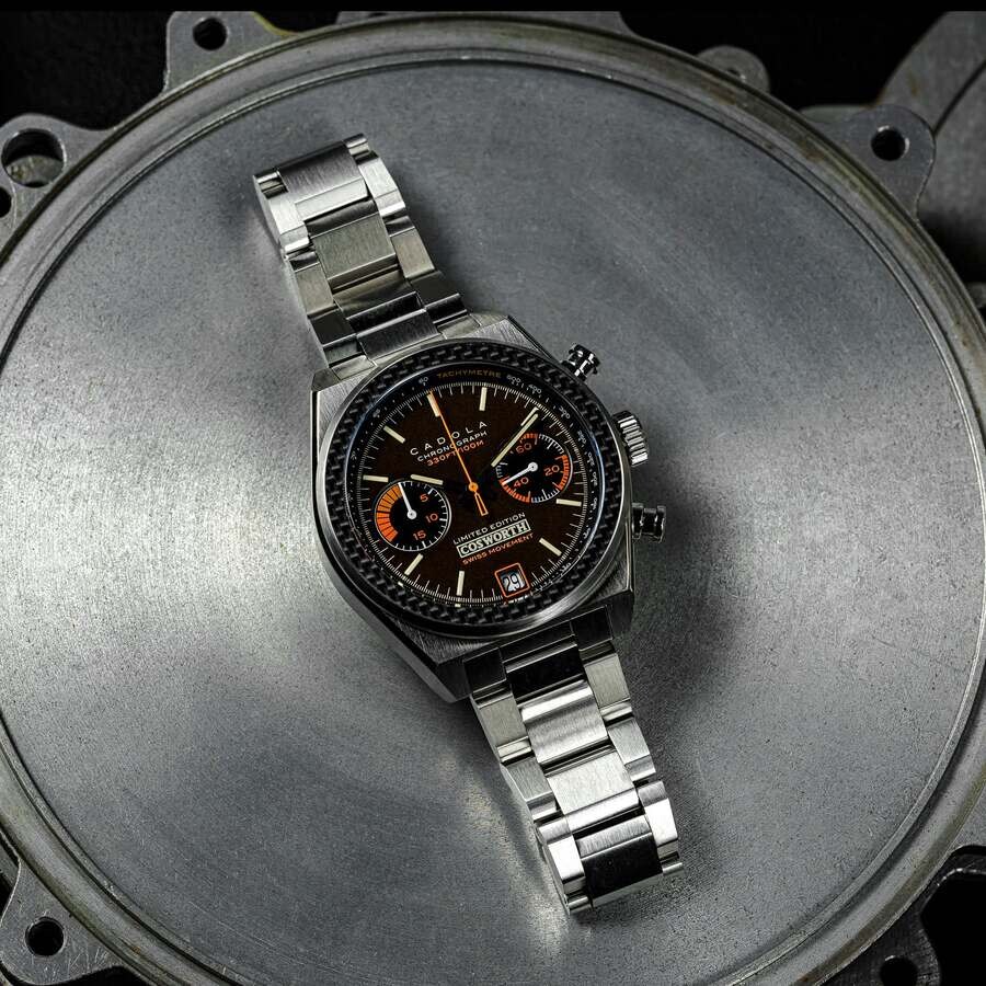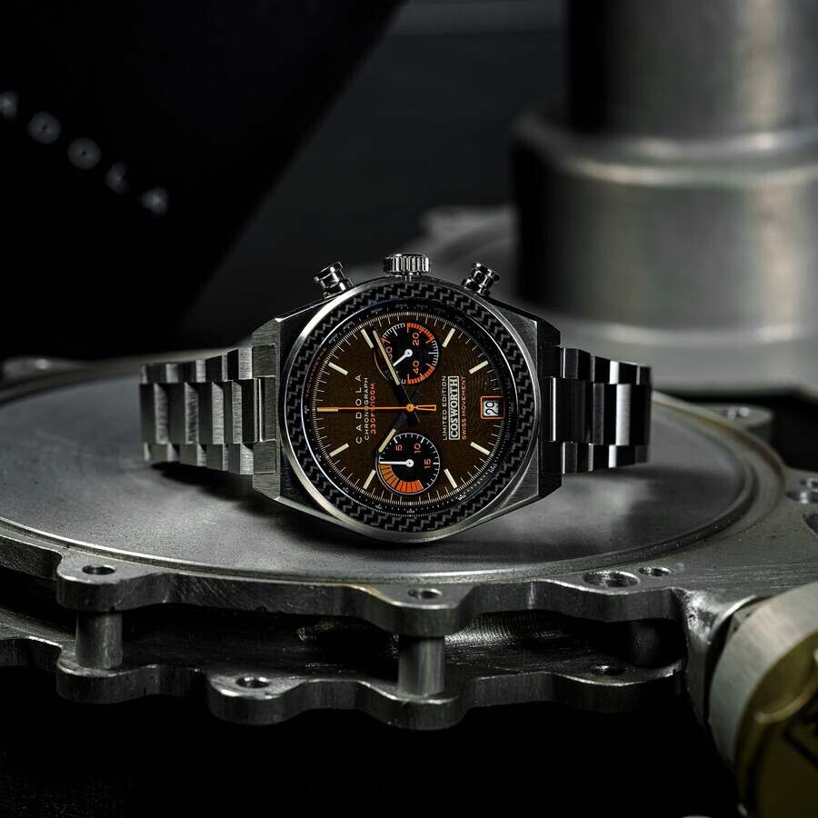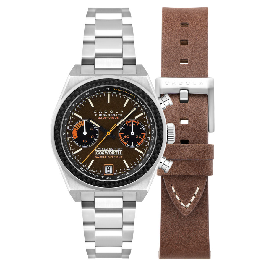 A limited-edition timepiece, the Cosworth Costin features the pinpoint precision of a high-specification Swiss chronograph movement enabling split time measurement. Robustly engineered, the Costin comes with carbon fiber bezel detailing, a bold bracelet design, and an additional strap for a degree of added versatility and style. Silver-tone stainless steel case and bracelet. Fixed black stainless steel bezel. Brown dial with black hands and Arabic numeral & index hour markers. Minute markers around the outer rim. Dial Type: Analog. Luminescent hands and markers. Date display at the 6 o'clock position. Chronograph - two sub-dials displaying: 60 second and 30 minute. ISA Caliber 8371 quartz movement. Scratch resistant mineral crystal. Pull / push crown. Solid case back. Round case shape, case size: 42 mm, case thickness: 14 mm. Band width: 20 mm, band length: 8 inches. Fold over clasp with a safety release. Water resistant at 100 meters / 330 feet. Functions: chronograph, date, hour, minute, second. Cosworth Costin Series. Casual watch style. Cadola Cosworth Costin Chronograph Quartz Brown Dial Men's Watch CD-1040-22.