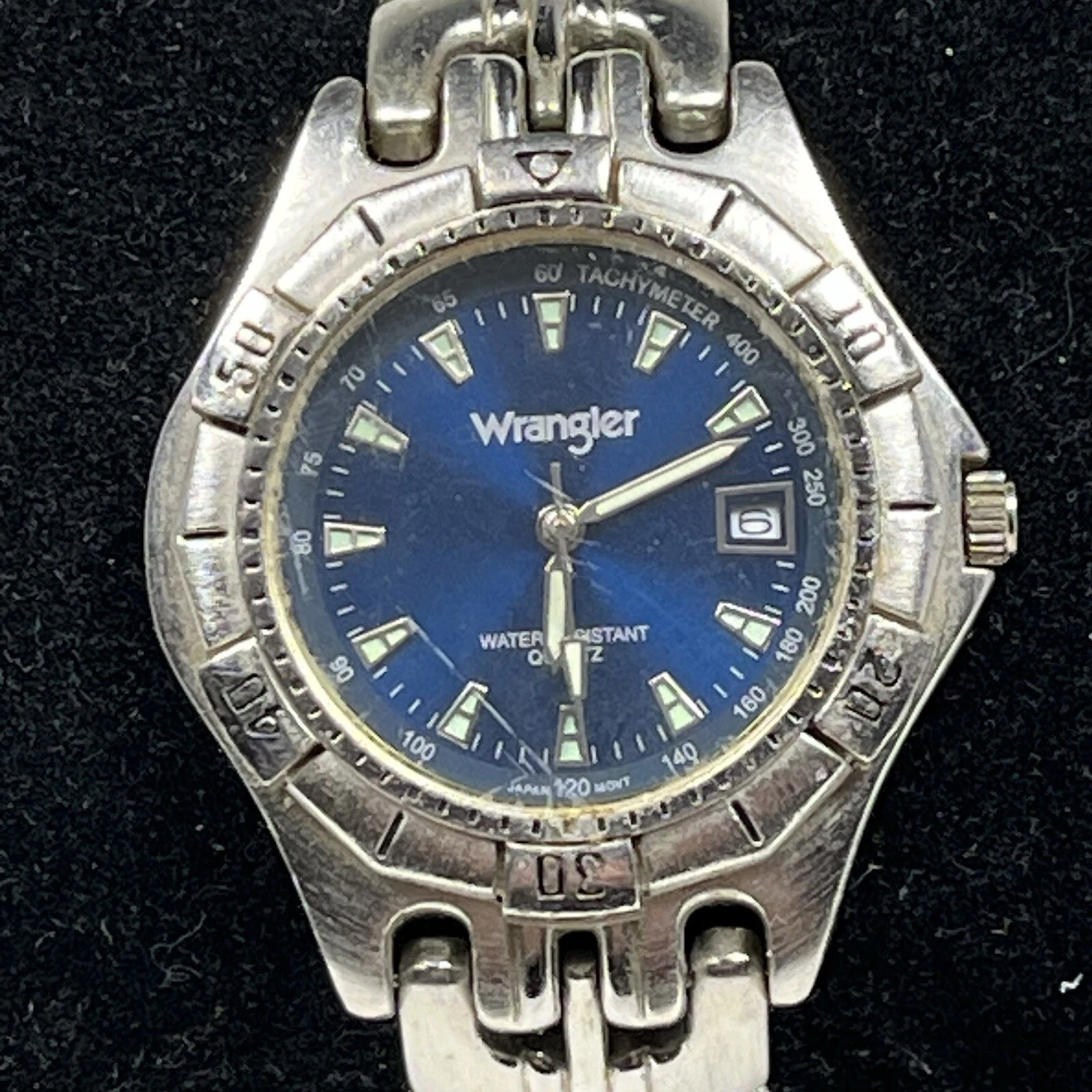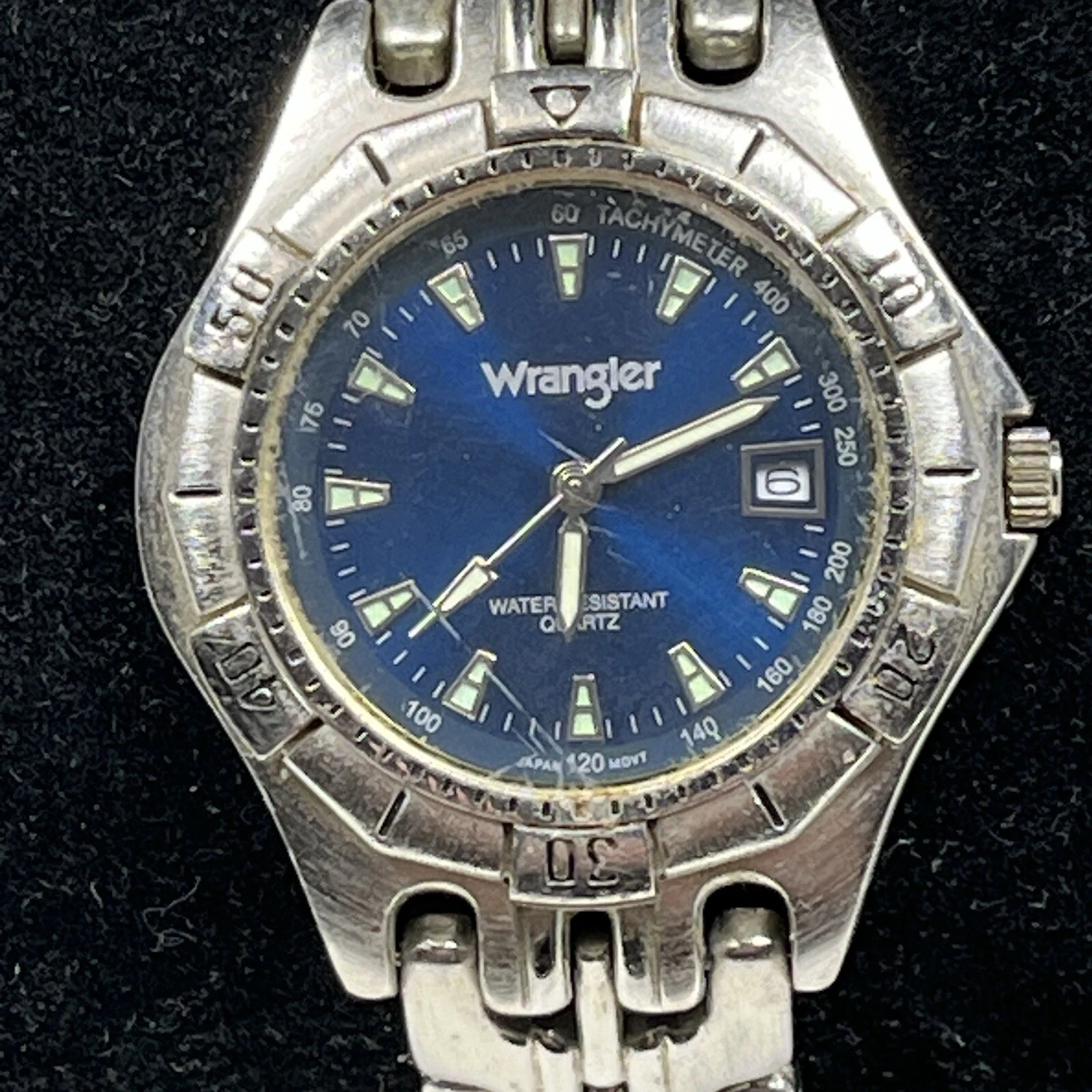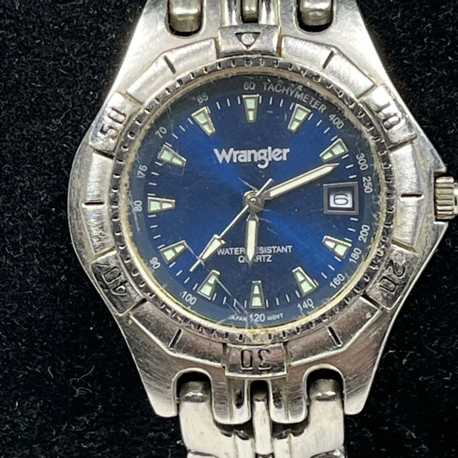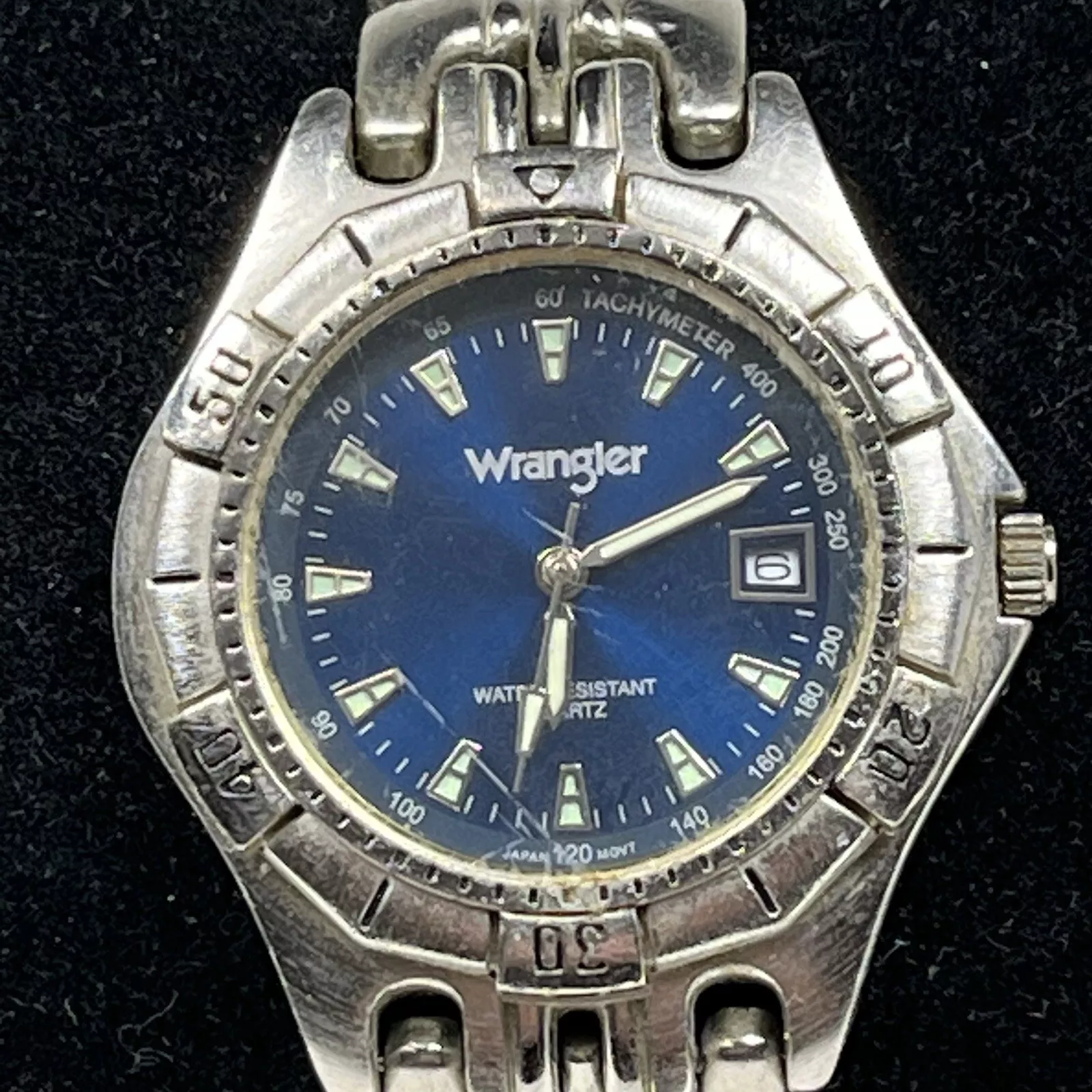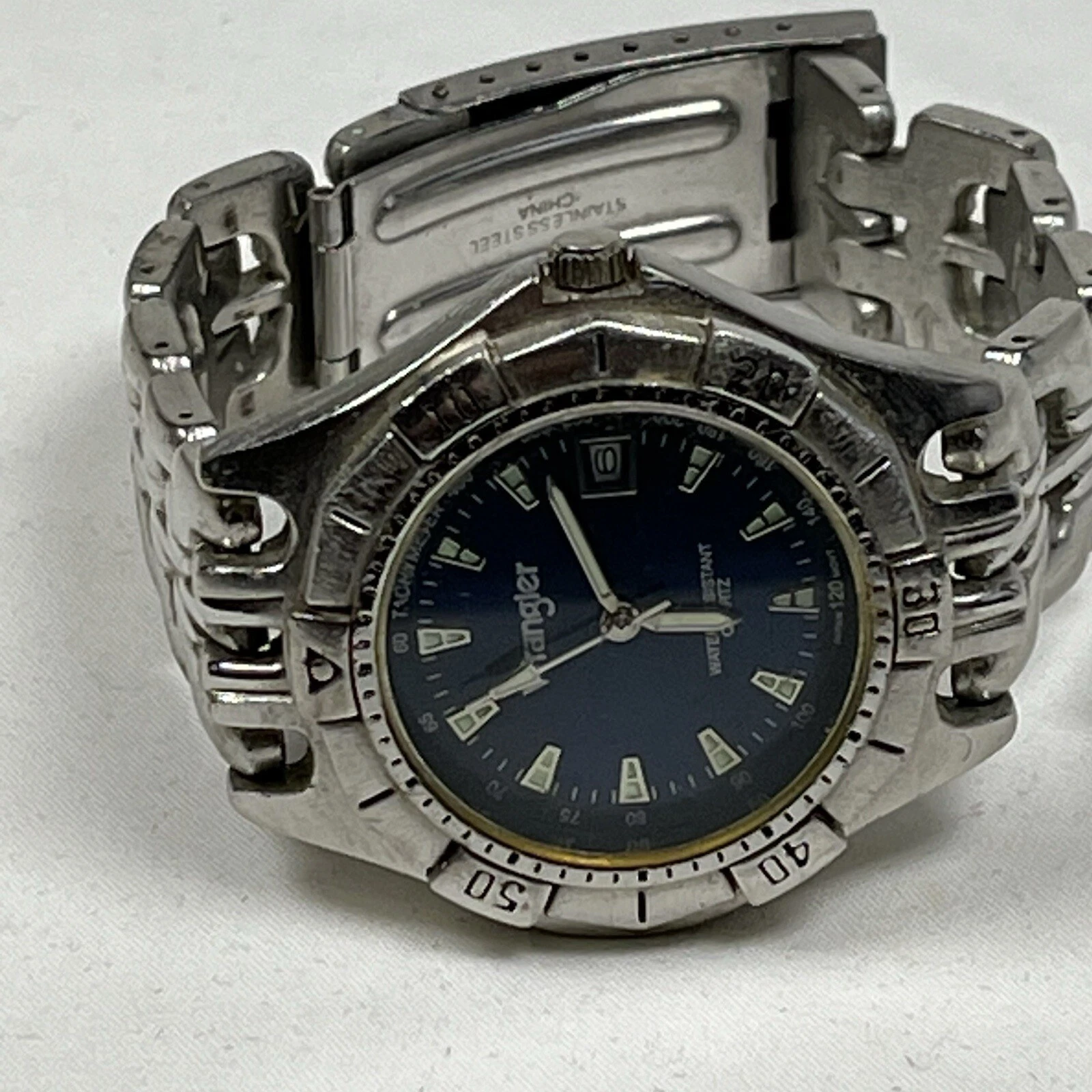 Vintage Wrangler Quartz Watch Men 30m Silver Blue Rotating Bezel Date New Batter
