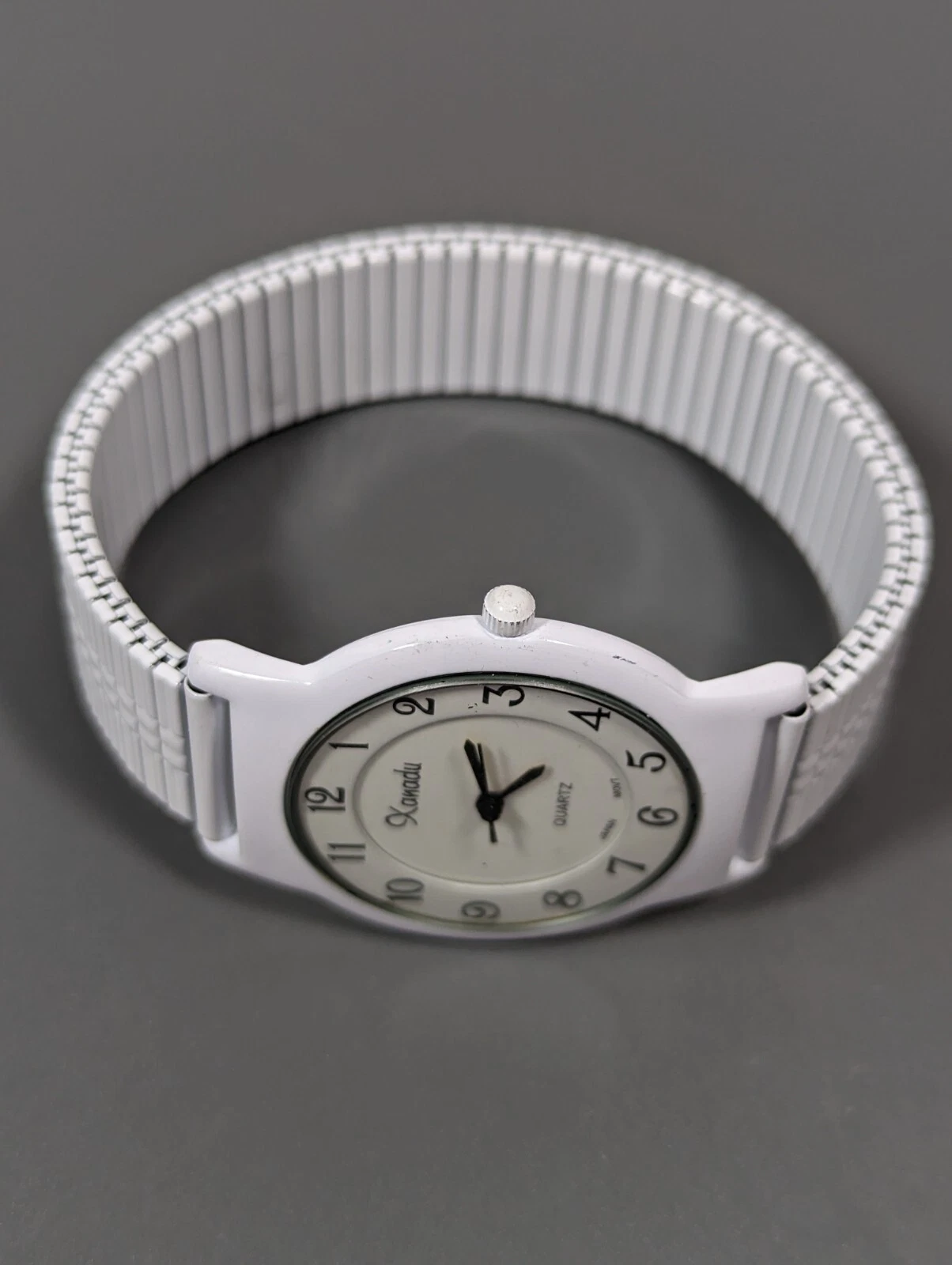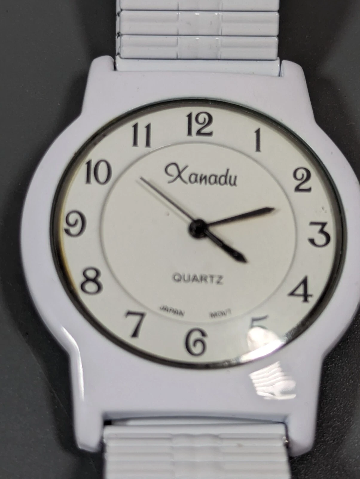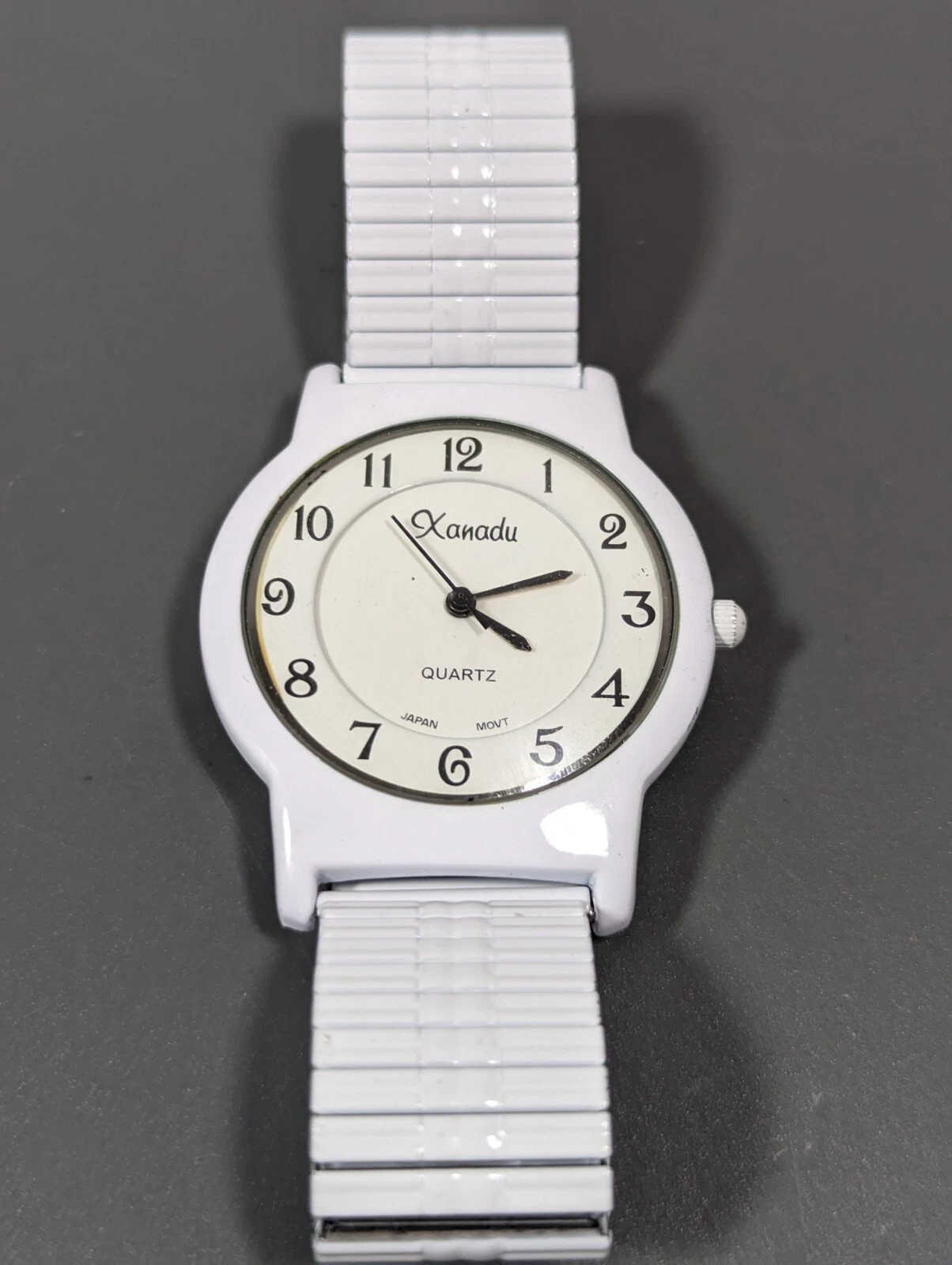 Xanadu Womans White Dial Round Case Staibless Steel Sstretch Band Watch