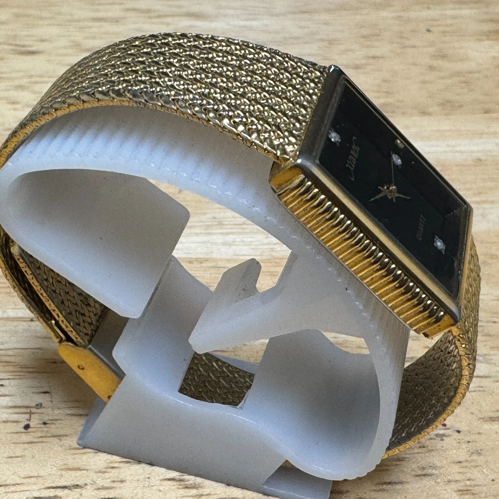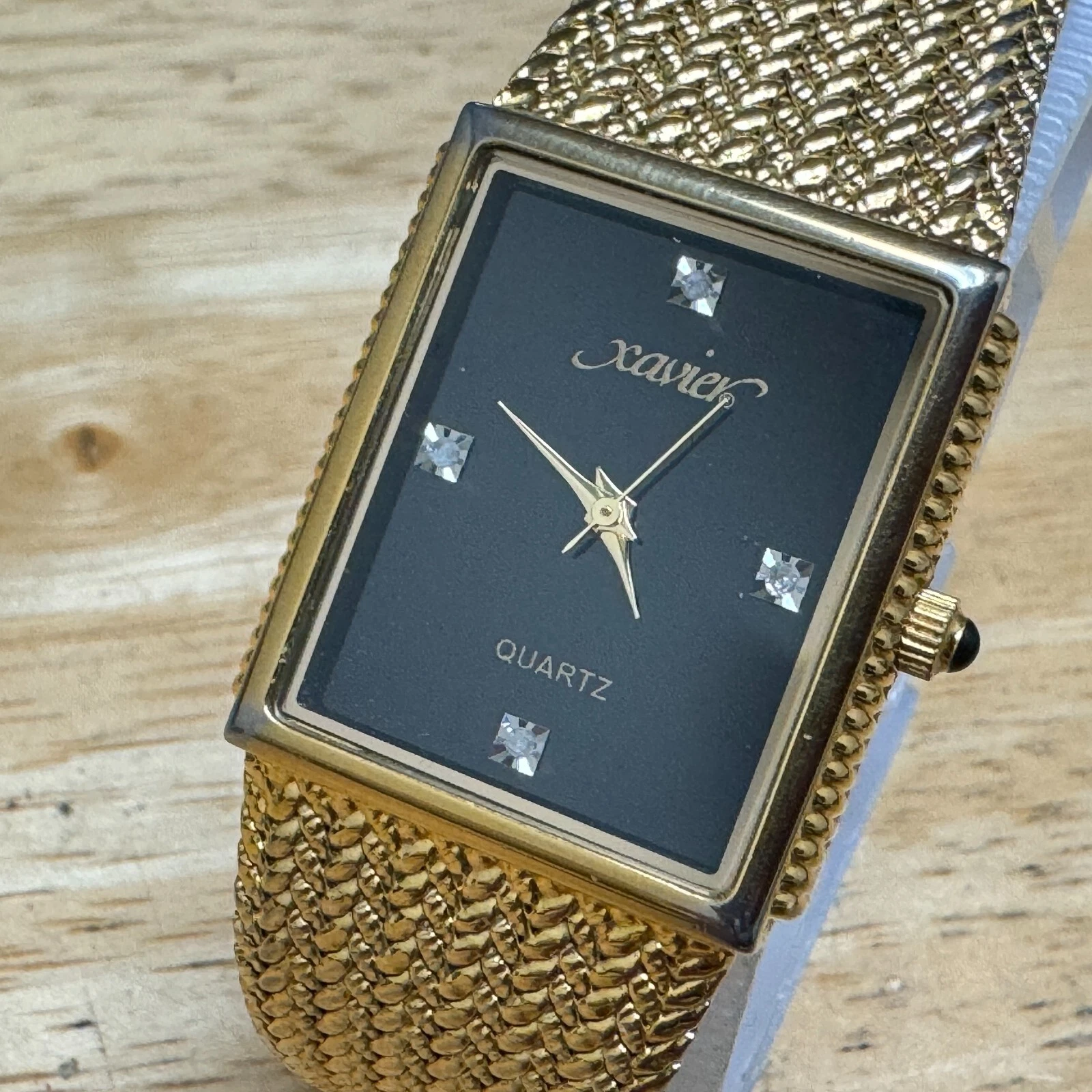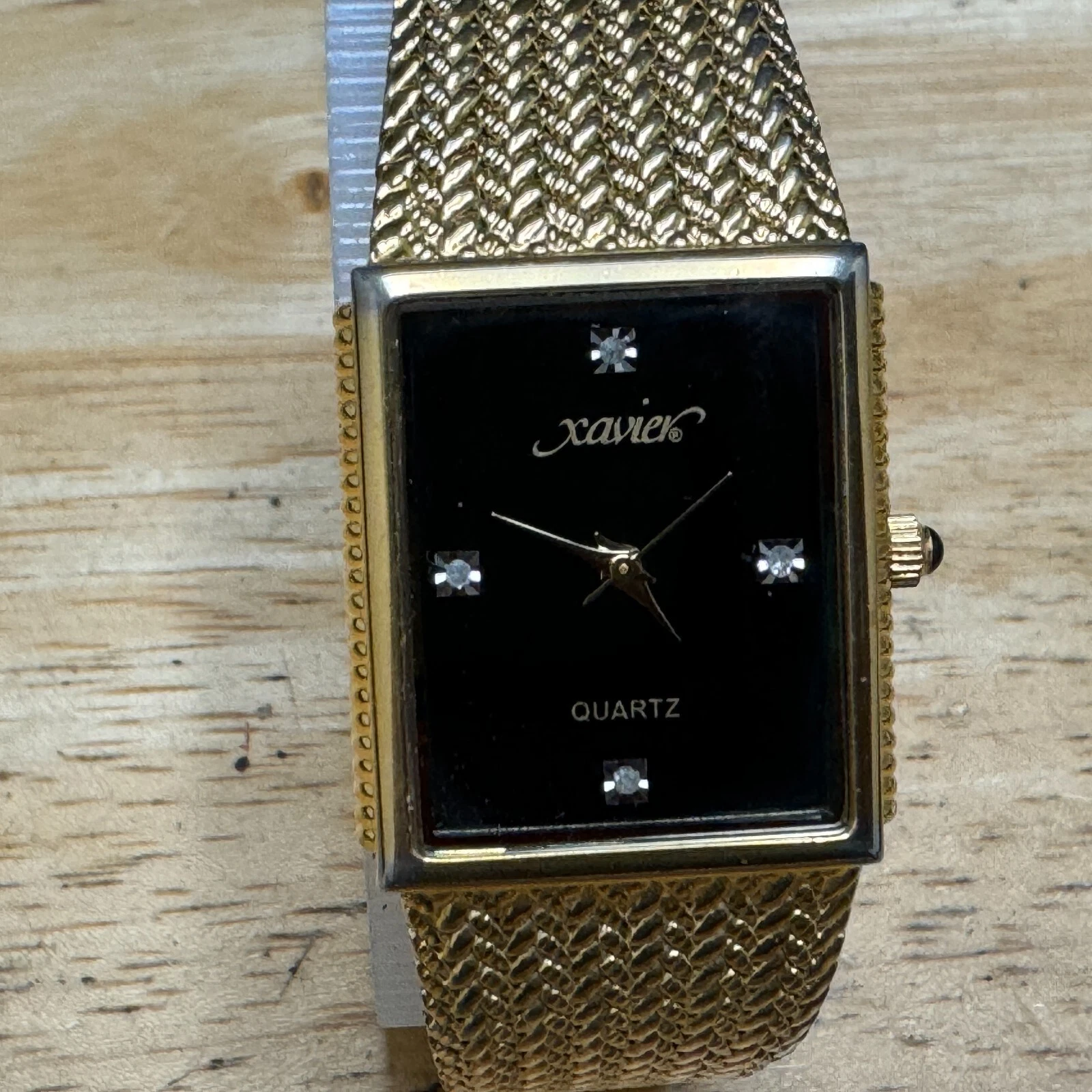 Xavier Quartz Watch Men Swiss Parts Gold Tone Black Rectangle Diamond New Batter
