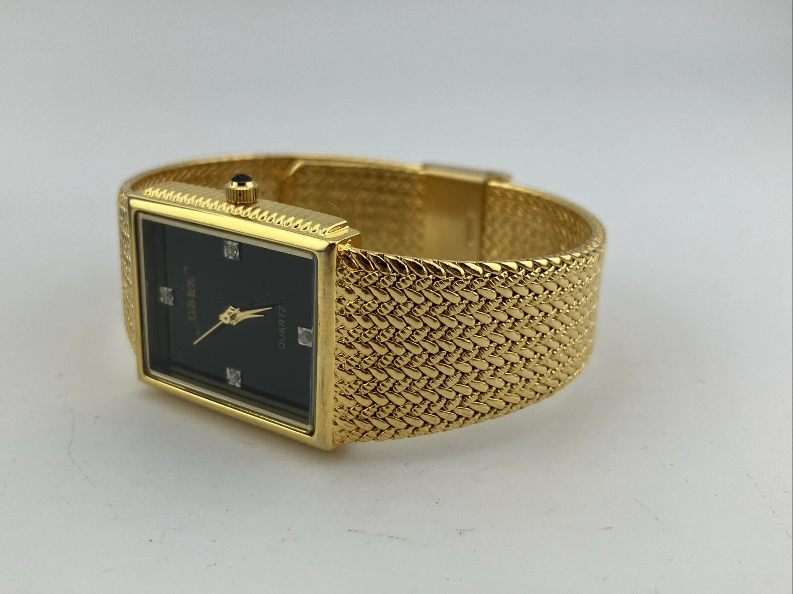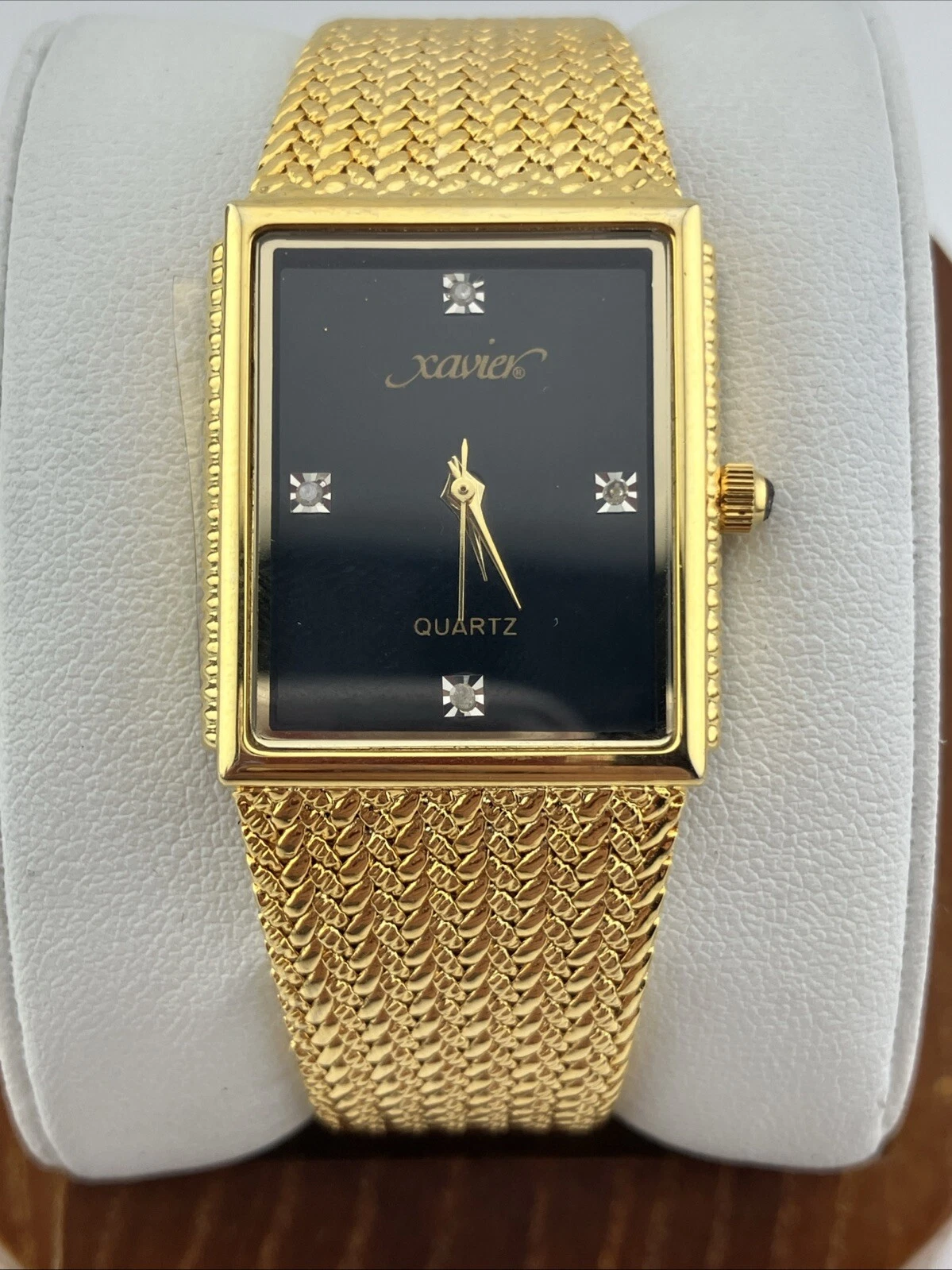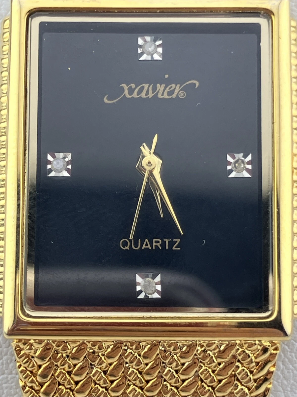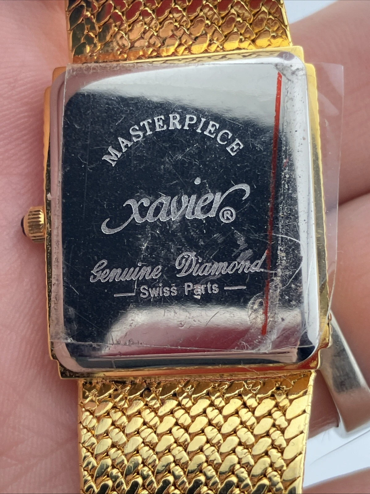 Vtg Xavier Ladies 26mm Watch Gold Tone Black Tank Dial Genuine Diamonds - RUNS