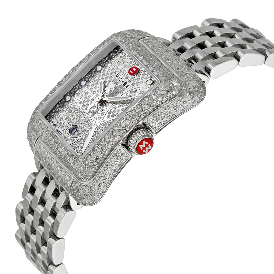 Stainless steel case with a stainless steel bracelet. Fixed stainless steel set with diamonds. Diamond pave dial with silver-tone hands and dot hour markers. Dial Type: Analog. Luminescent hands. Date display at the 6 o'clock position. Quartz movement. Scratch resistant sapphire crystal. Pull / push crown. Solid case back. Case diameter: 35 mm. Tonneau case shape. Deployment clasp. Water resistant at 50 meters / 165 feet. Functions: date, hour, minute, second. Additional Info: limited edition. Dress watch style. Michele Extreme Butterfly Ultimate Pave Diamond Ladies Watch MWW04B000022.