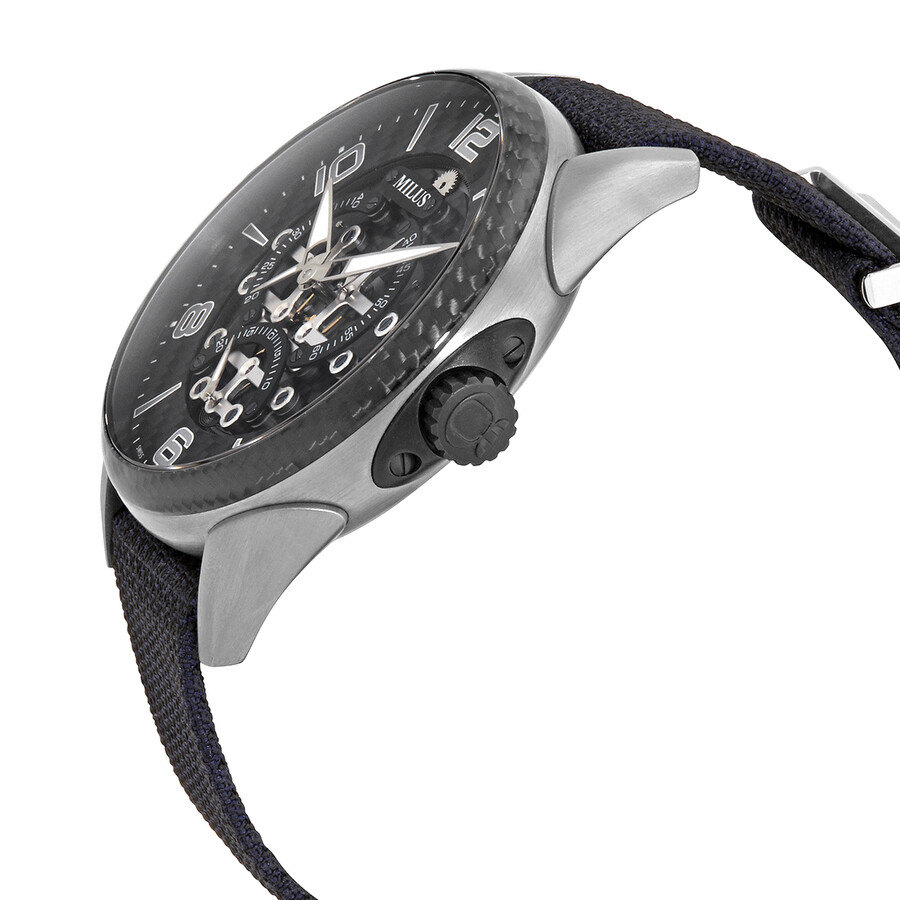 Silver-tone titanium case with a black leather strap. Fixed black carbon fiber bezel. Carbon fiber dial with silver-tone hands and index-Arabic numerals hour markers. Dial Type: Analog. Luminescent hands. Date display between 4 and 5 o'clock position. Three sub-dials displaying: retrograde 20 second indicators. ETA Caliber 2892-A2 H8 automatic movement with a 40-hour power reserve. Scratch resistant sapphire crystal. Pull / push crown. Transparent case back. Round case shape, case size: 45 mm. Band width: 21 mm. Buckle clasp. Water resistant at 30 meters / 100 feet. Functions: date, hour, minute, second. Tirion Series. Dress watch style. Watch label: Swiss Made. Pre-owned Milus Tirion Automatic Men's Watch TIRI702.