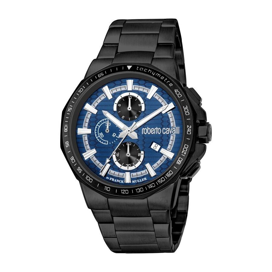 Black stainless steel case and bracelet. Fixed tachymeter scale black stainless steel bezel. Blue dial with silver-tone hands and index hour markers. Minute markers around the outer rim. Dial Type: Analog. Luminescent hands and markers. Date display at the 4 o'clock position. Chronograph - three sub-dials displaying: 60 second, 30 minute and 1/10th of a second. Quartz movement. Scratch resistant sapphire crystal. Round case shape, case size: 44 mm. Fold over clasp with a safety release. Water resistant at 100 meters / 330 feet. Functions: chronograph, date, hour, minute, second. Fashion Watch Series. Fashion watch style. Watch label: Swiss Made. Roberto Cavalli Fashion Watch Chronograph Quartz Blue Dial Men's Watch RV1G200M0061.