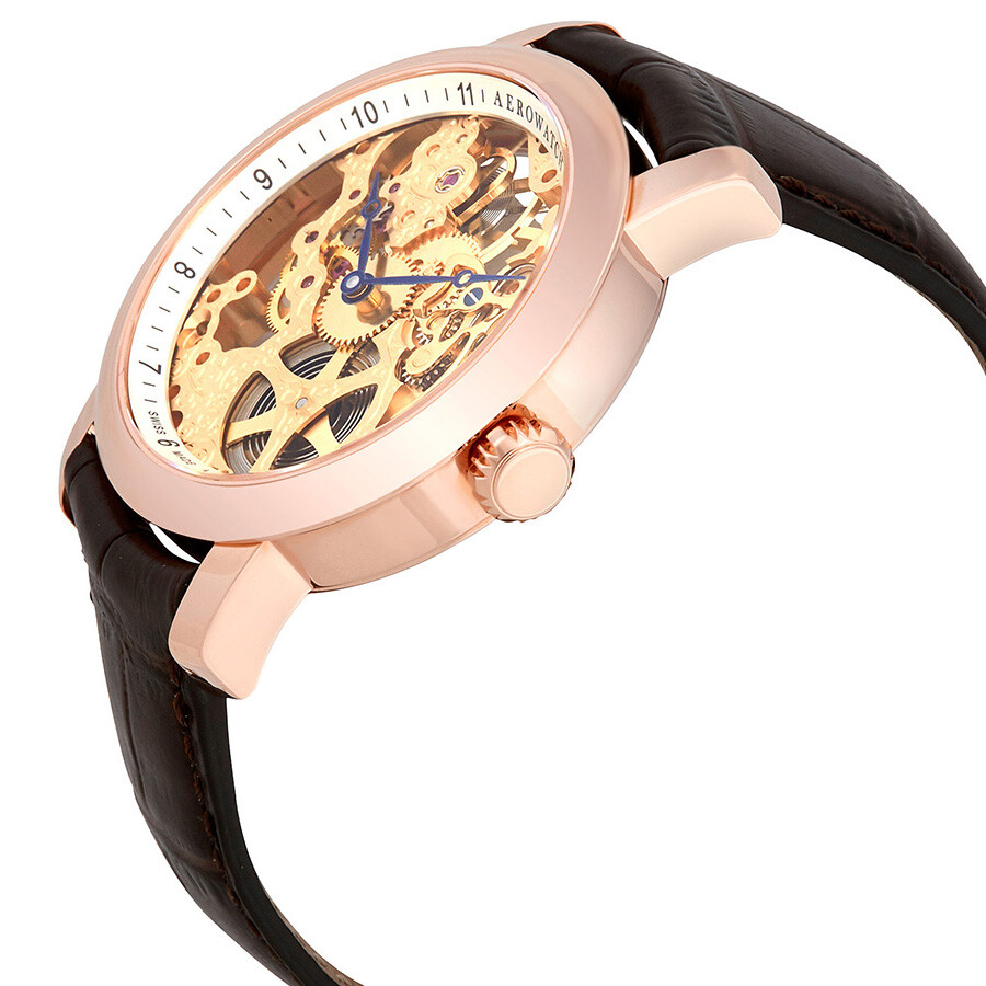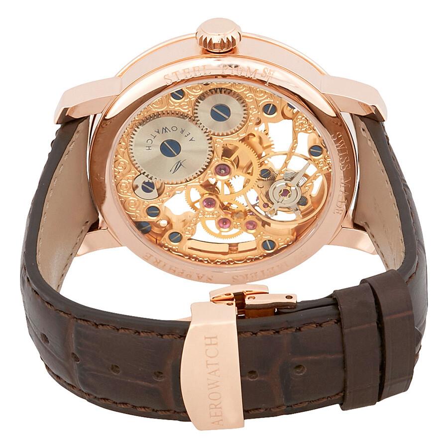 Rose gold-tone stainless steel case with a dark brown leather strap. Fixed rose gold-tone bezel. Skeleton dial with blue hands and Arabic numeral hour markers. Minute markers around the outer rim. Dial Type: Analog. Unitas calibre 16 1/2 hand wind movement with a 46-hour power reserve. Scratch resistant sapphire crystal. Transparent e case back. Case size: 45 mm. Case thickness: 11.70 mm. Round case shape. Band width: 22 mm. Fold over clasp. Water resistant at 50 meters / 165 feet. Functions: hour, minute. Dress watch style. Watch label: Swiss Made. Aerowatch Renaissance Hand Wound Skeleton Dial Men's Watch A 57931 RO01.