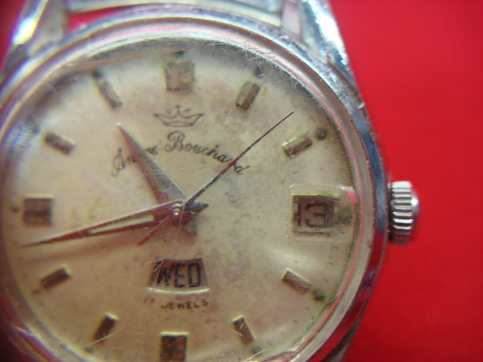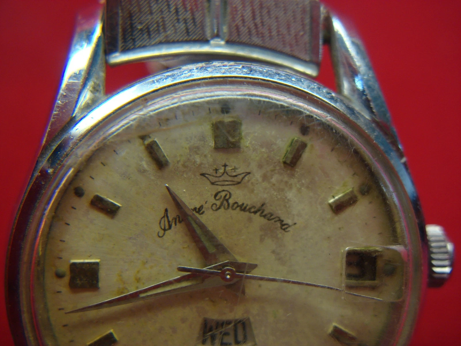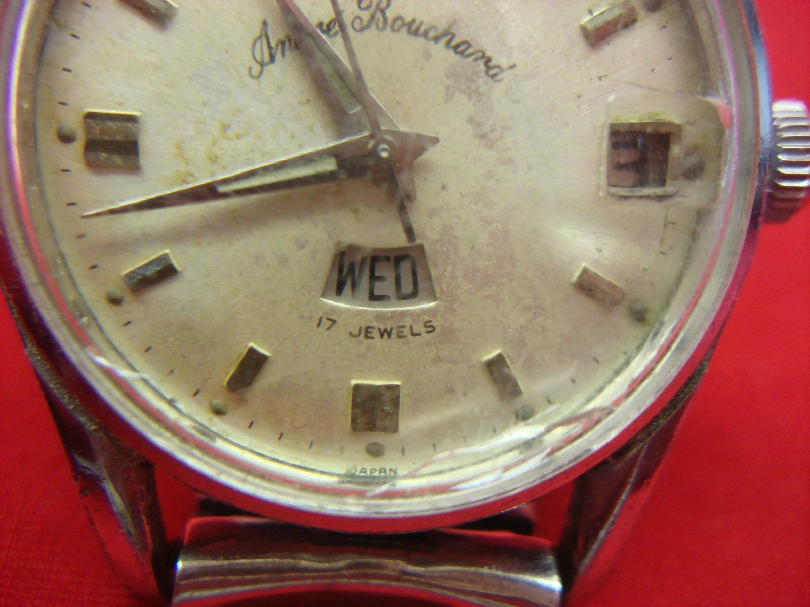 ANDRE BOUCHARD - VINTAGE 17 JEWEL WRISTWATCH W/DAY/DATE - NEEDS SOME TLC