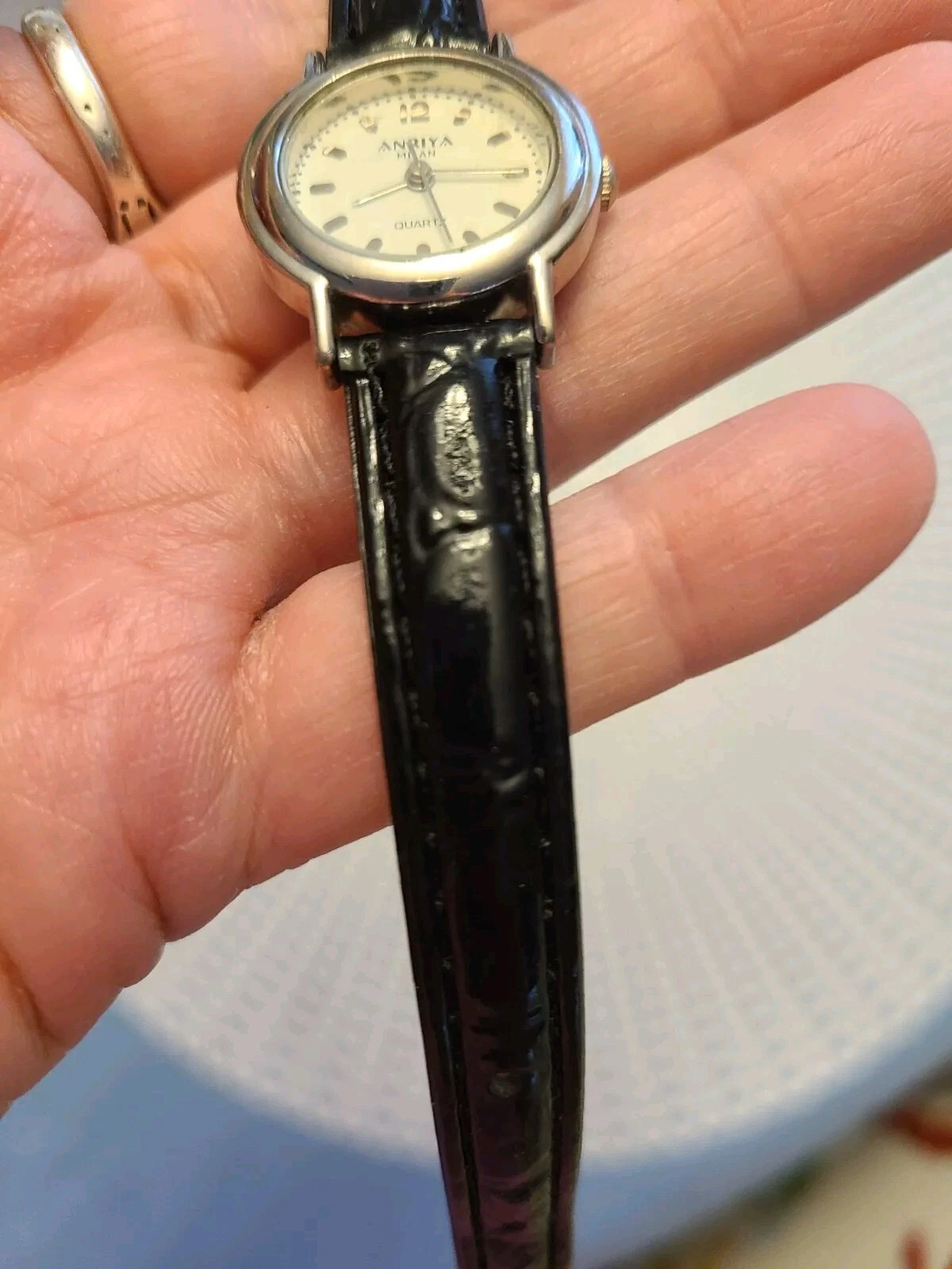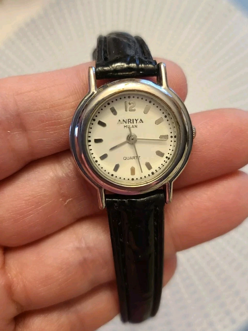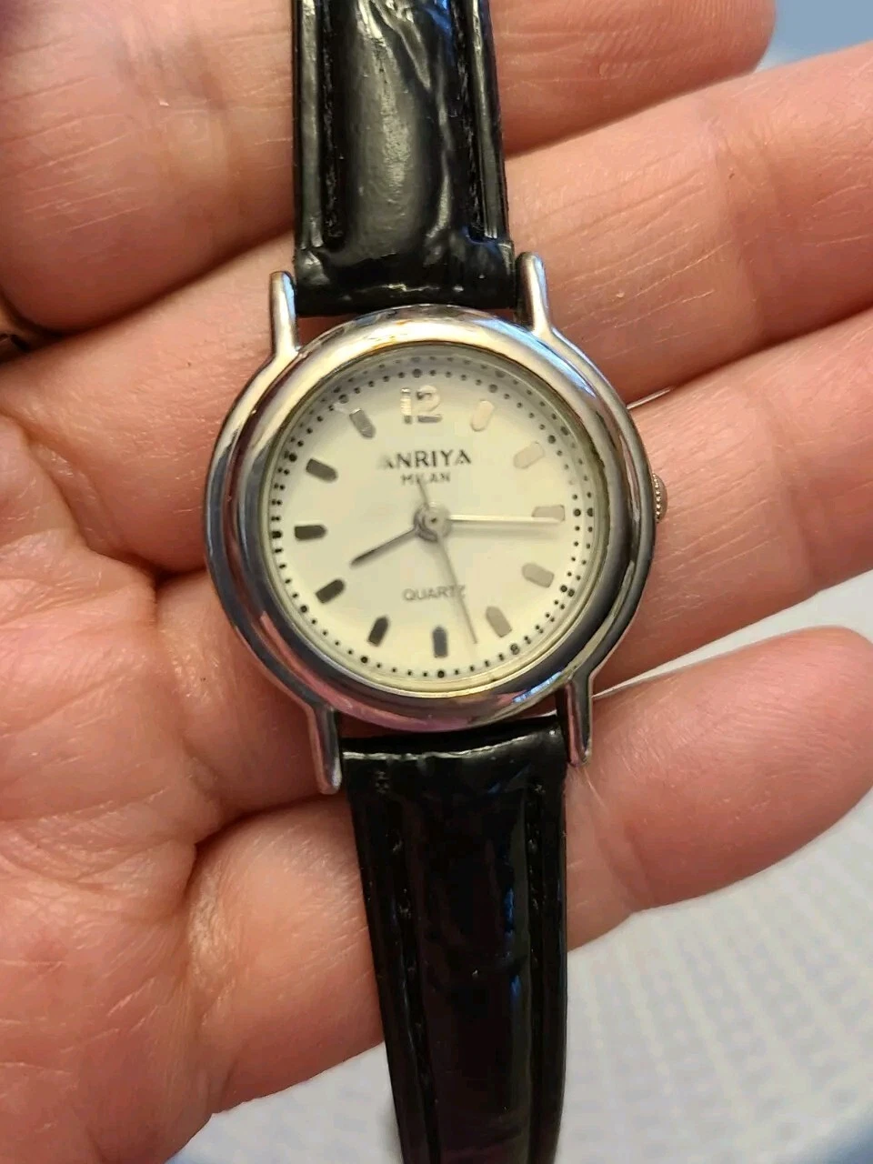 Anriya Milan Quartz Watch Silver Tone Case with Black Leather Band SS Back EUC