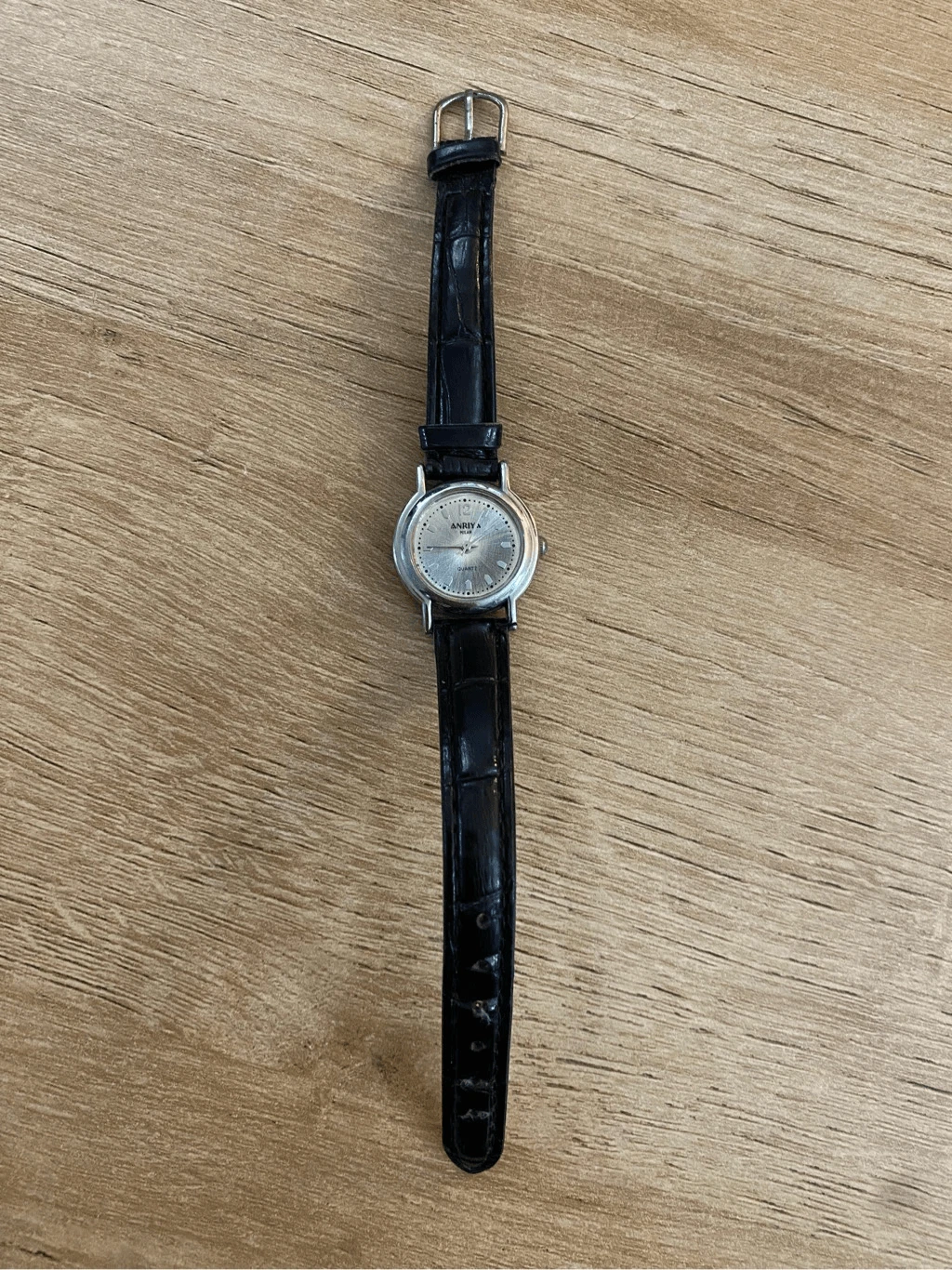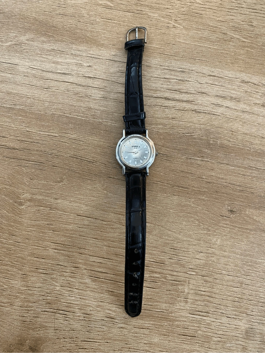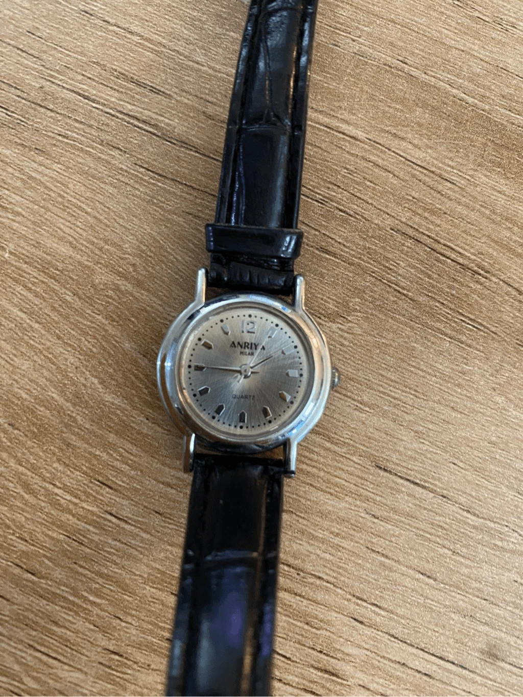 Anriya Milan Quartz Watch Silver Tone Case with Black Leather Band SS Back EUC