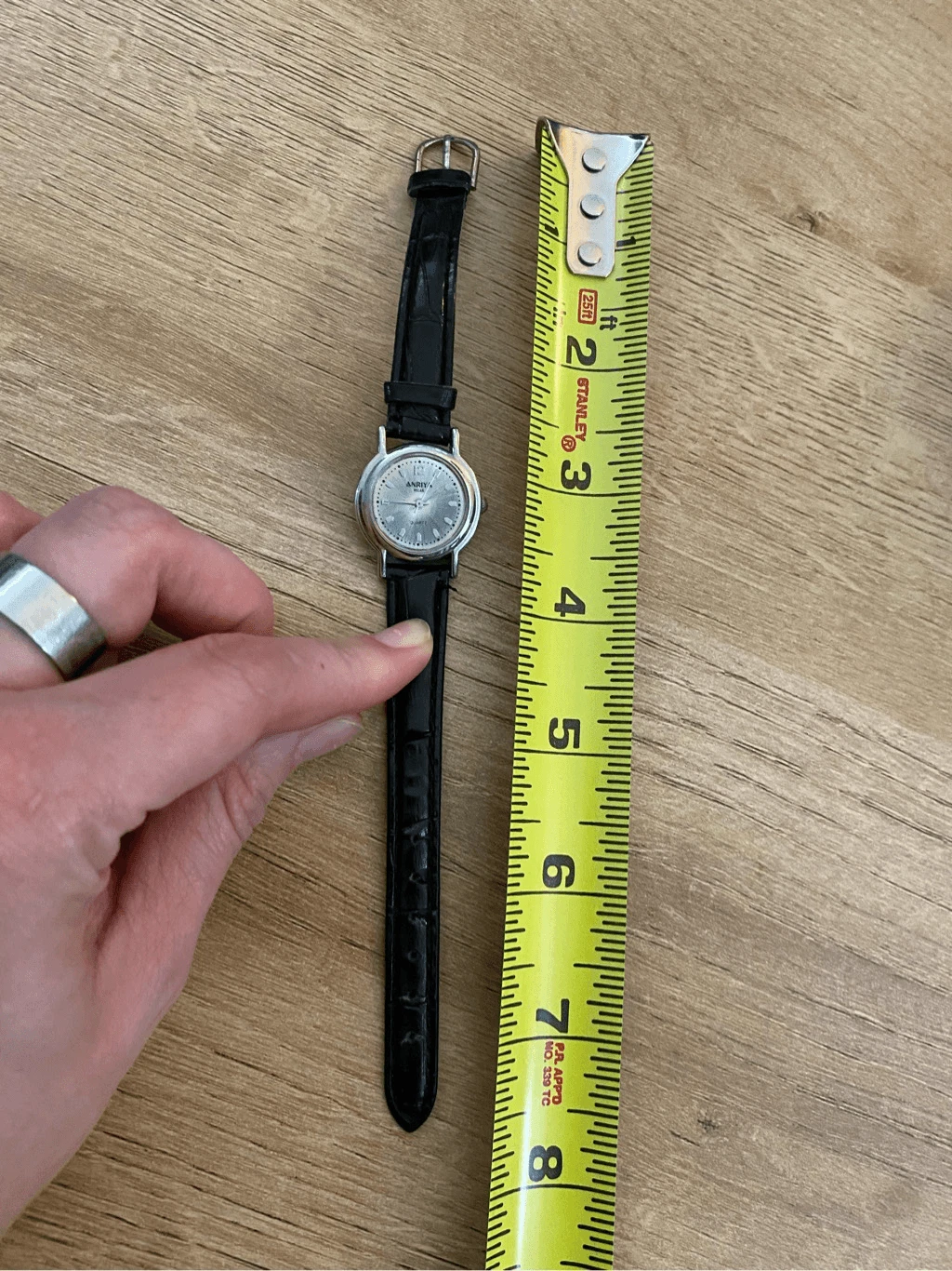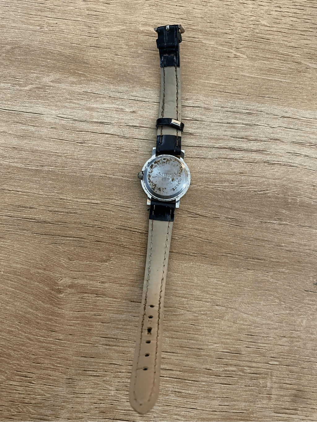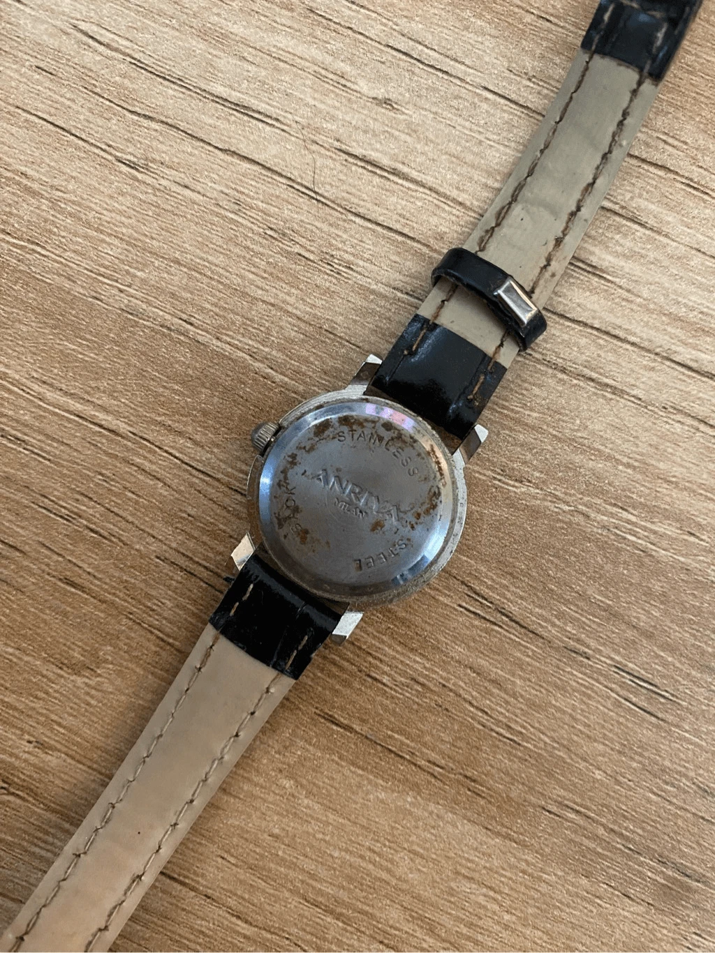 Anriya Milan Quartz Watch Silver Tone Case with Black Leather Band SS Back EUC