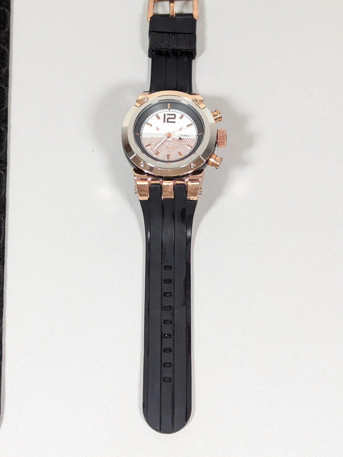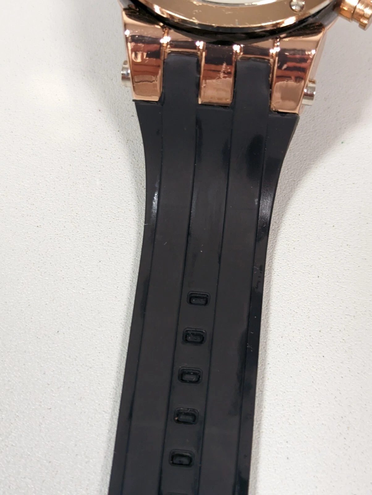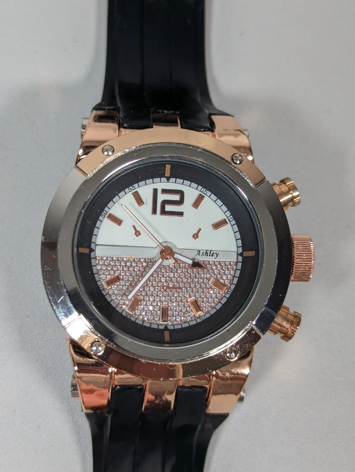 Ashley Princess Rose Gold Tone Round Case Black Silicone Band Watch 8.5 Inch