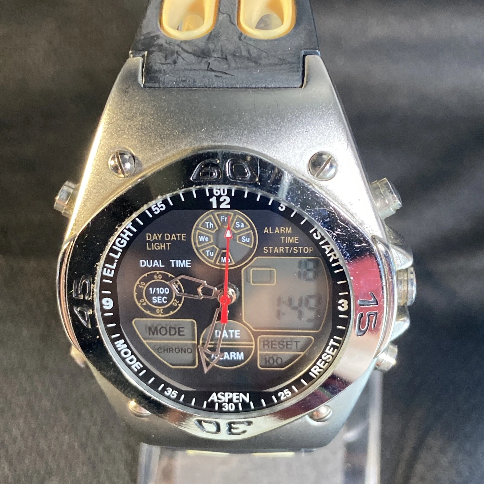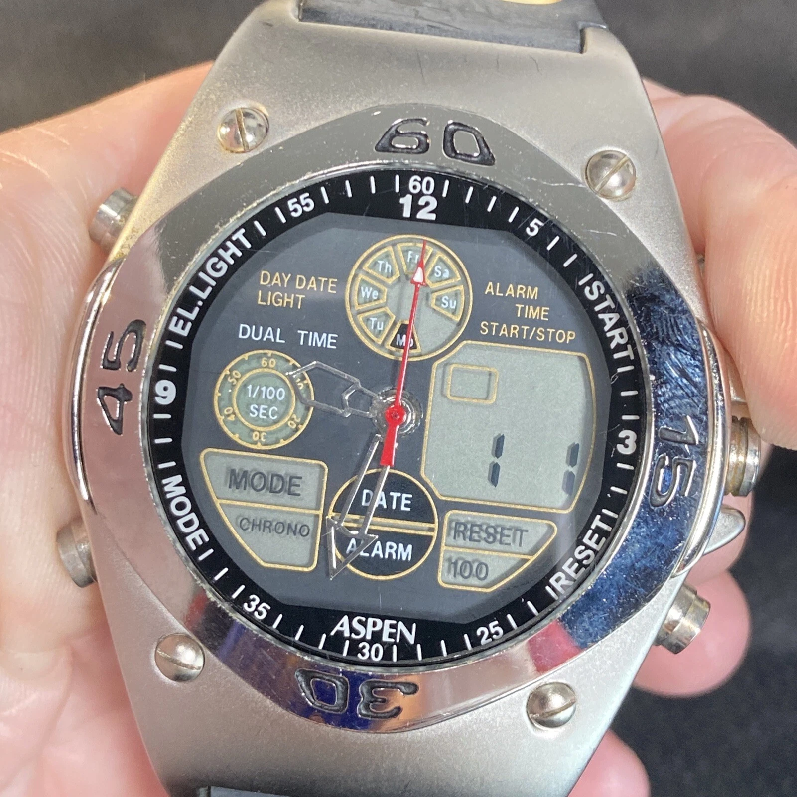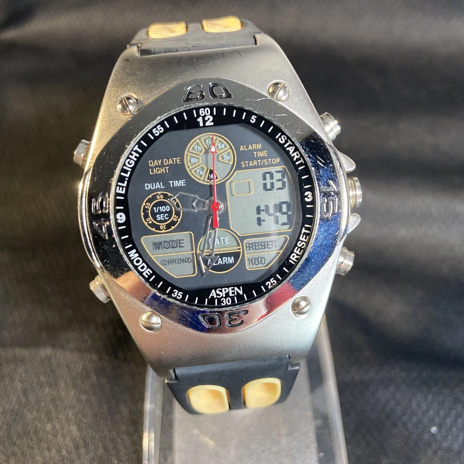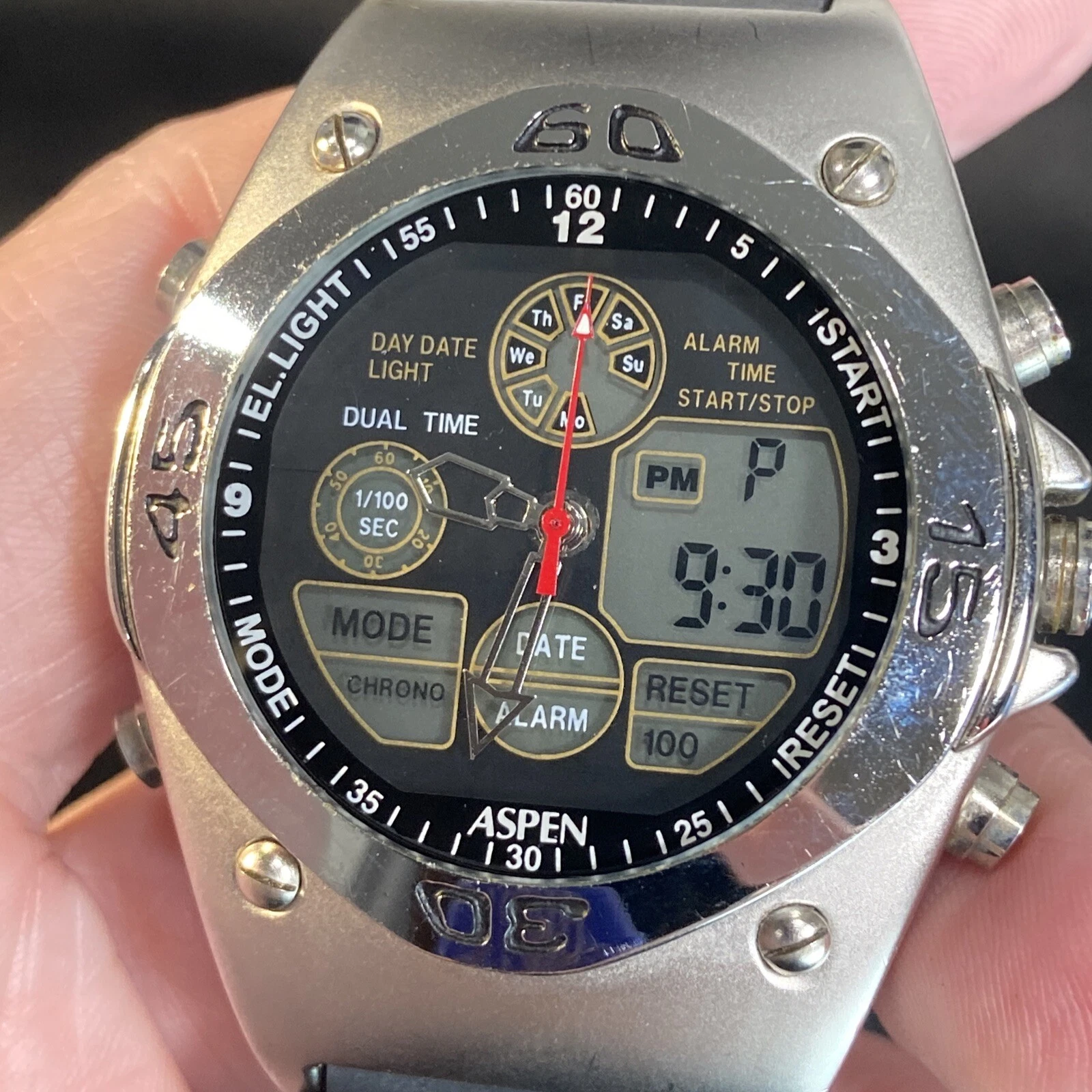 Vtg Men's Aspen Dual Time Alarm 40mm Day Date Chrono Chrome Rare Style READ