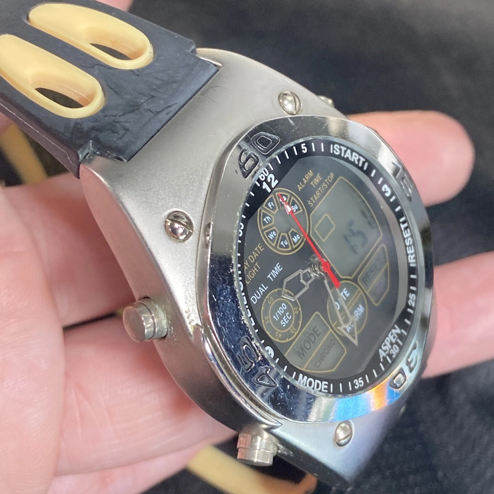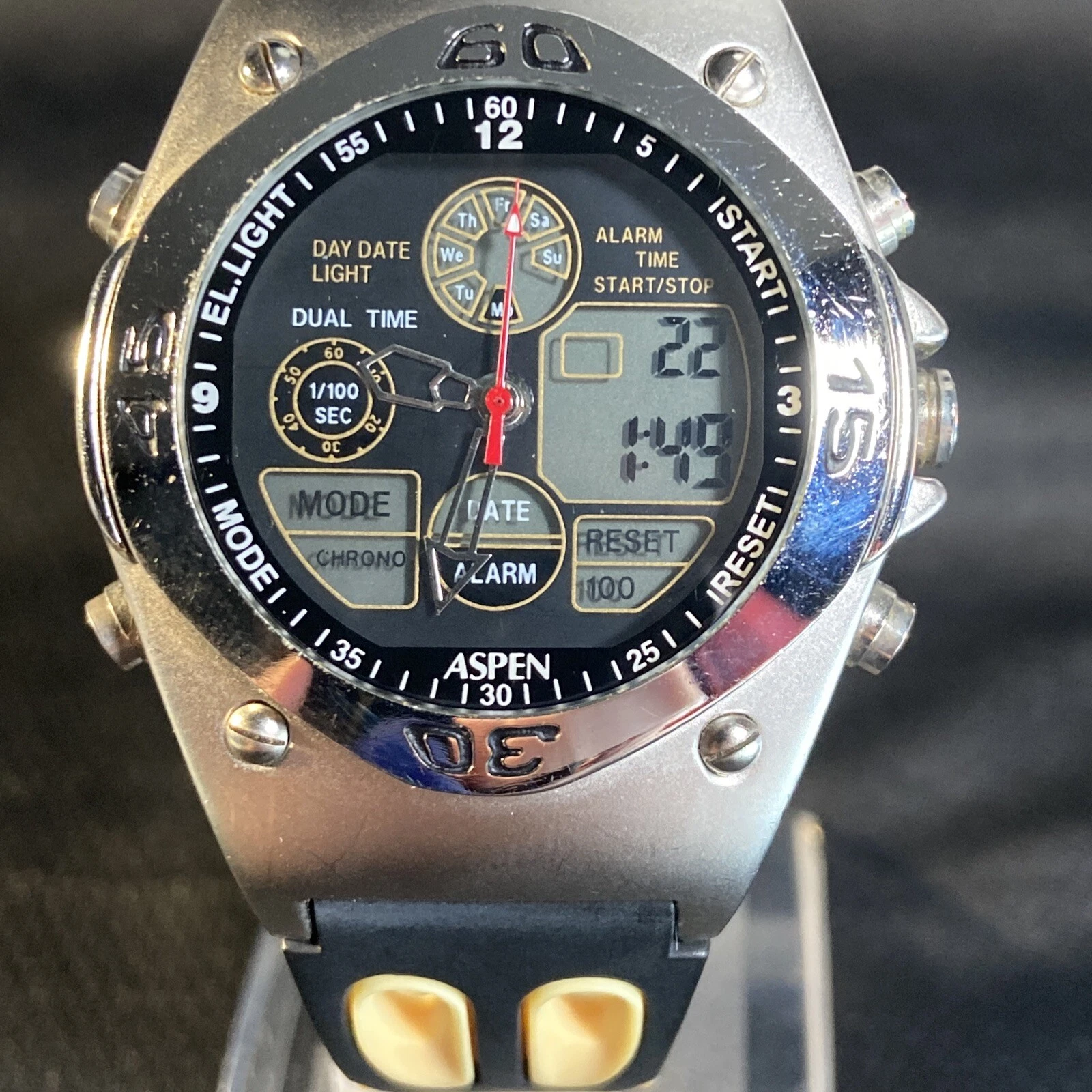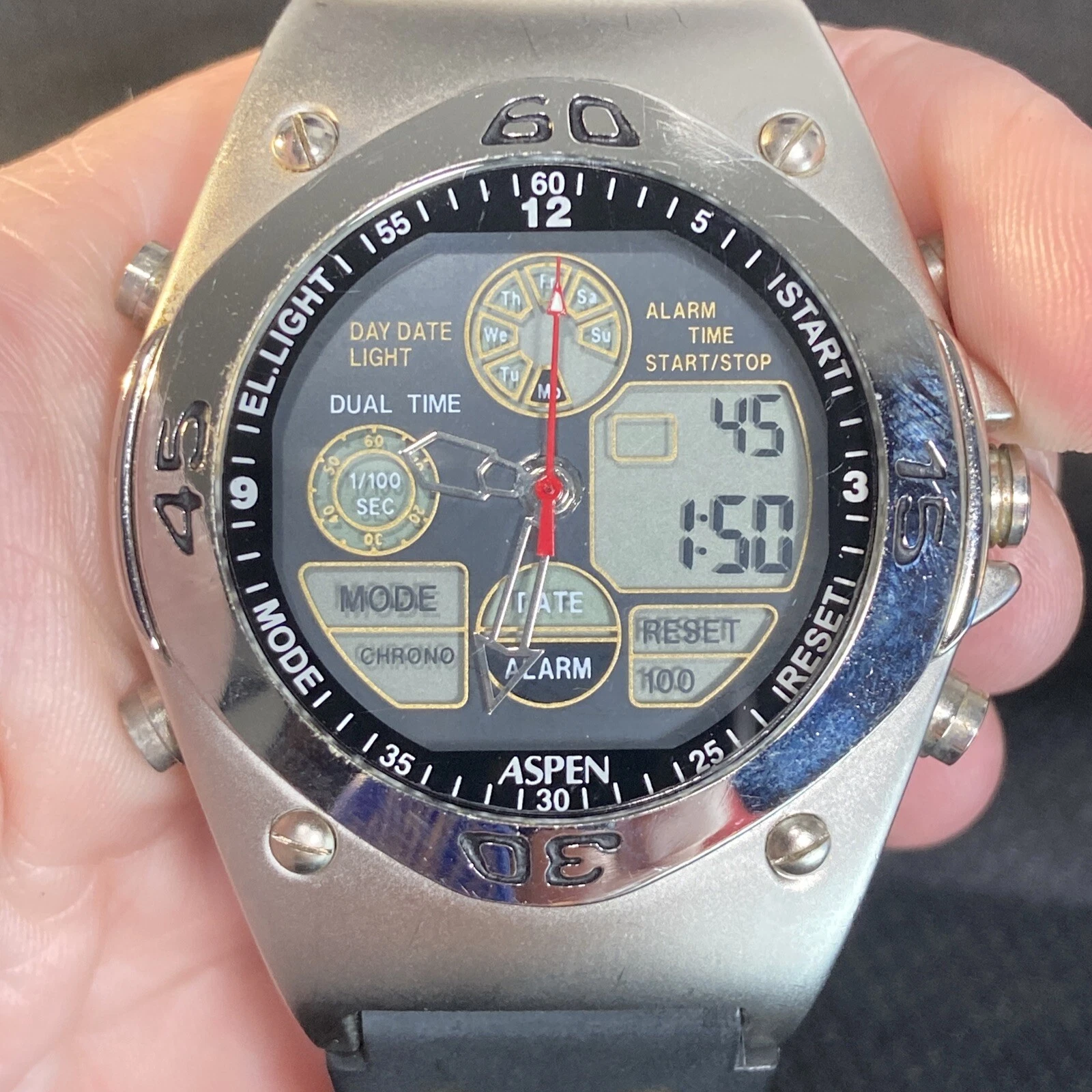 Vtg Men's Aspen Dual Time Alarm 40mm Day Date Chrono Chrome Rare Style READ