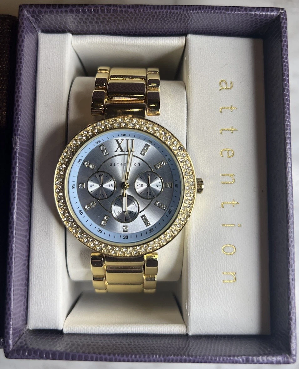 Attention Gold Tone Ladies Round Crystal Decorated Dial Never Removed From Box