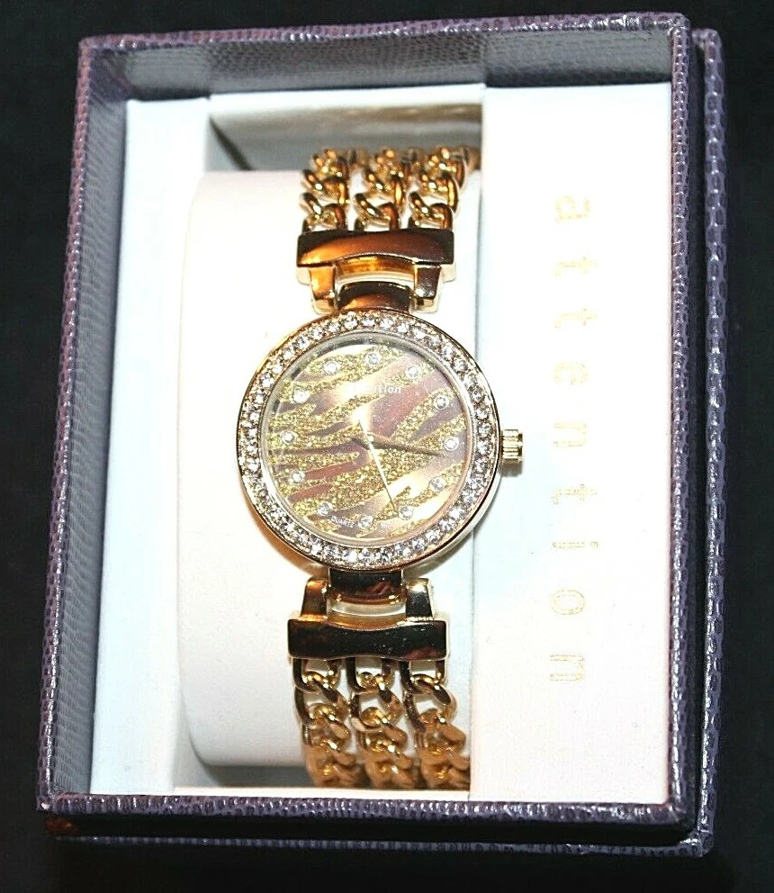 Attention Gold Tone Crystal Rimmed Glittery Animal Print Wristwatch Watch