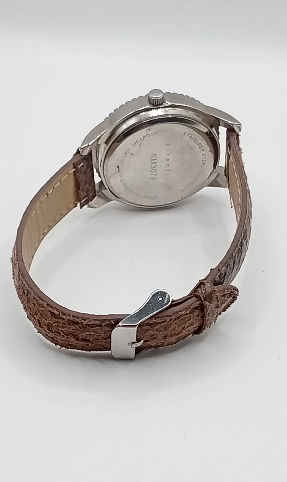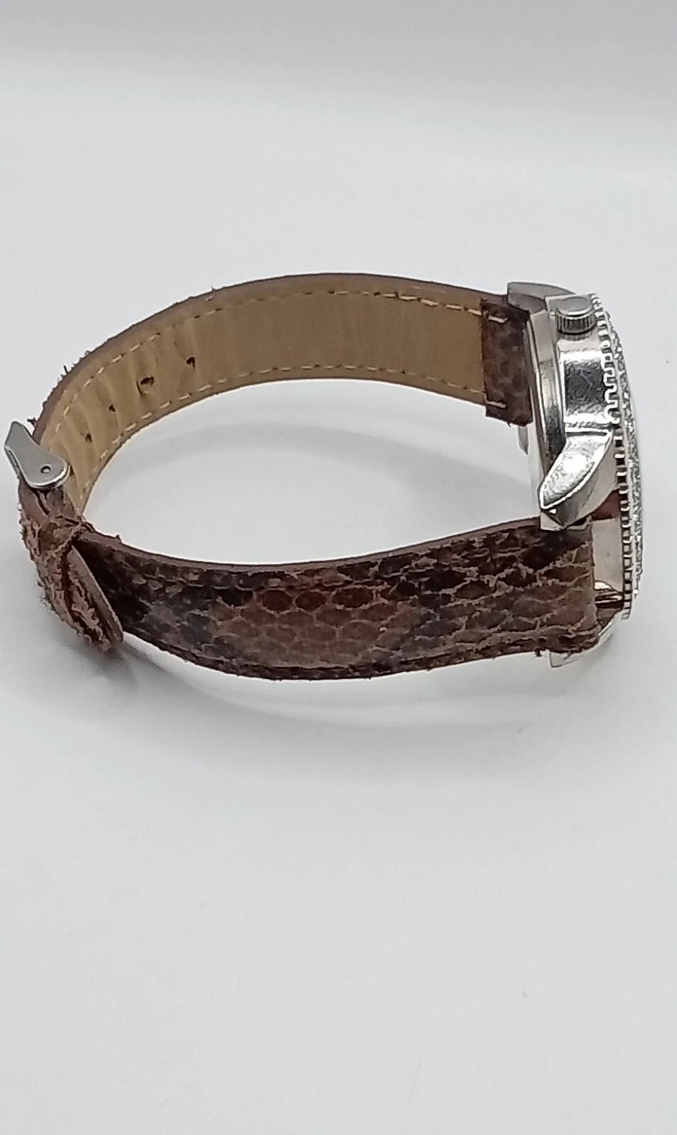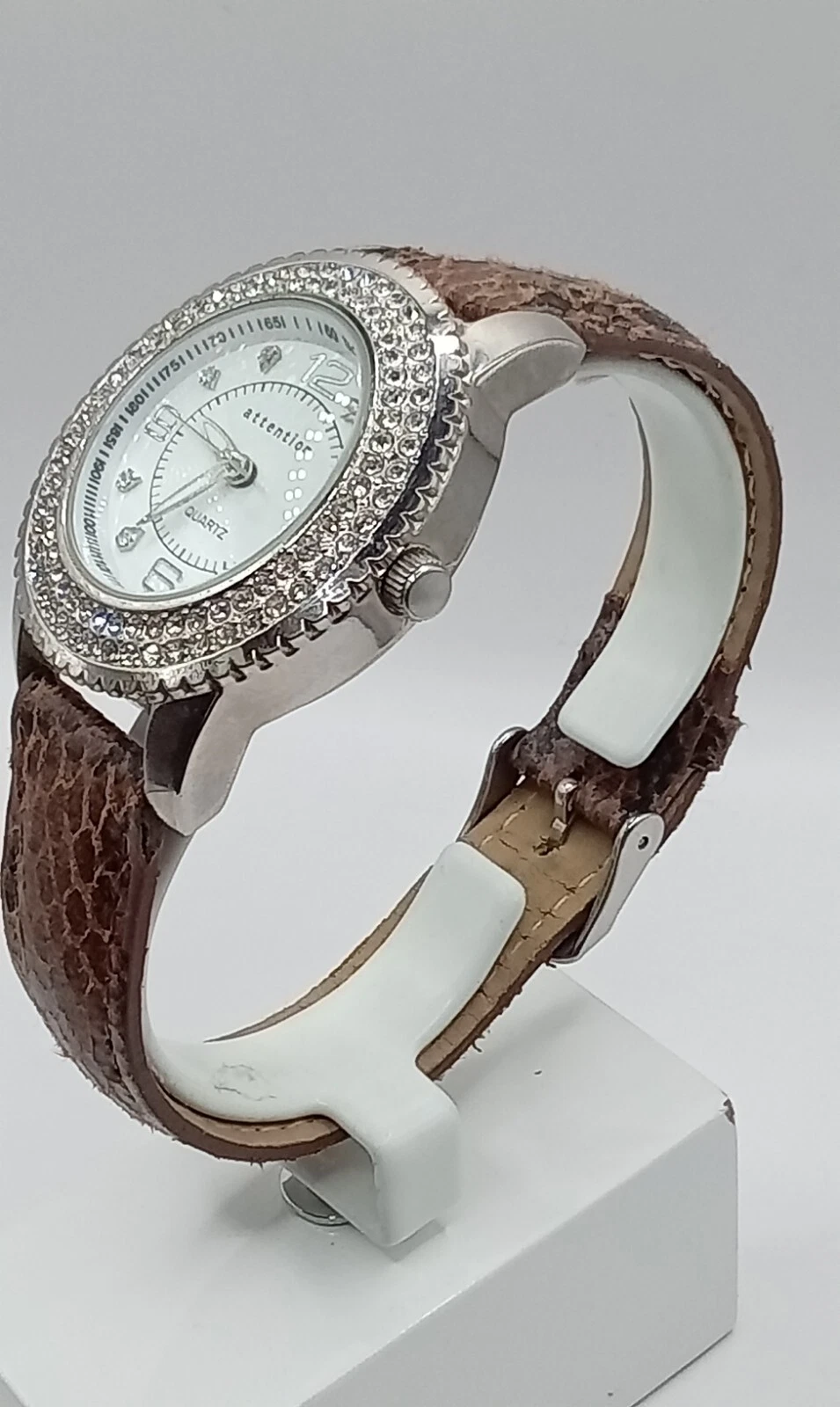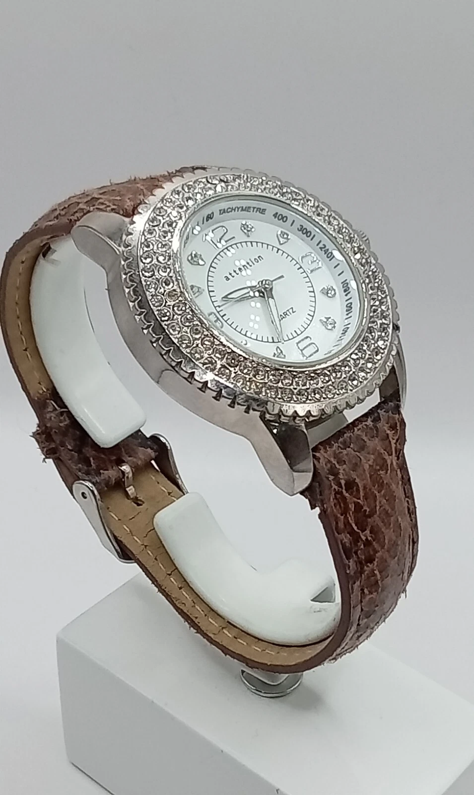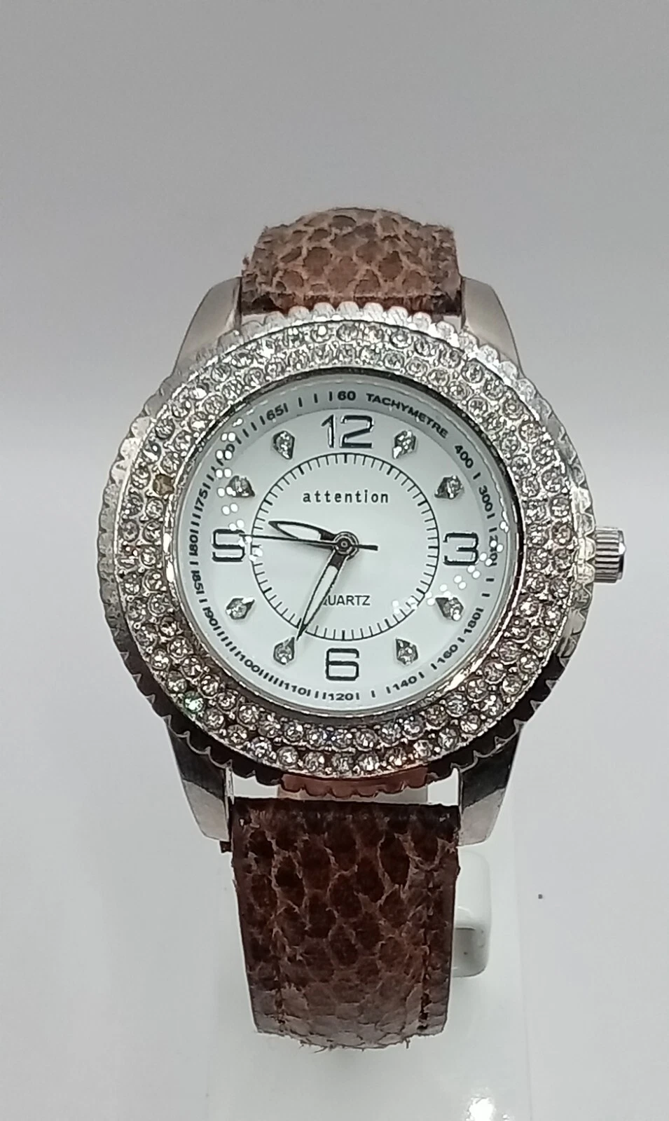 Attention Women's Quartz Watch Rhinestone Bezel Brown Band- New Battery